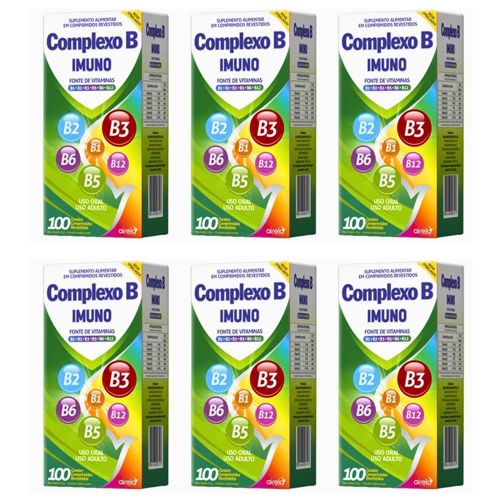 Kit Complexo B Imuno – 6 Caixas com 100 Comprimidos Cada? Fonte completa de vitaminas do Complexo B? Fortalece a imunidade e auxilia na recuperação da anemia? Contribui para a saúde do sistema nervoso, pele, cabelos e unhas? Reduz o estresse e melhora a função intestinalO Complexo B Imuno reúne todas as vitaminas essenciais do Complexo B (B1, B2, B3, B5, B6, B7, B9 e B12), garantindo 100% do valor diário recomendado por comprimido.Seu consumo regular proporciona inúmeros benefícios para a saúde, incluindo fortalecimento do sistema imunológico, suporte ao combate à anemia e auxílio na manutenção do bem-estar geral.Além disso, suas propriedades contribuem para o funcionamento saudável do sistema nervoso, ajudam na redução do estresse e favorecem a saúde da pele, cabelos e unhas.?? Kit com 6 caixas – Cada caixa contém 100 comprimidos?? Enviamos no mesmo dia?? Produto lacrado e de alta qualidade? Não contém glúten?? Peça já o seu!Este produto está dispensado da obrigatoriedade de registro conforme RDC 240/2018.