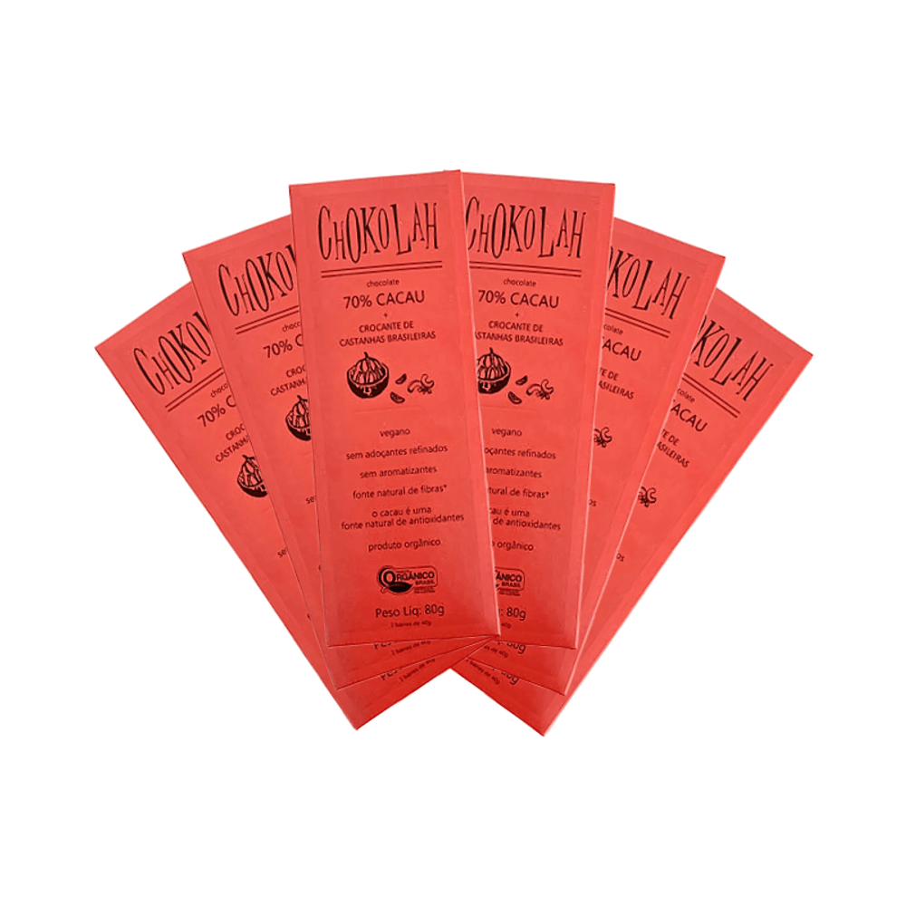 O Chocolate 70% Cacau com Castanhas Orgânico CHoKolaH possui a combinação perfeita, sua textura surpreende com o contraste entre a cremosidade do chocolate e a crocância das castanhas._x000D_ _x000D_ Com política própria de qualidade, a produção da Chokolah usa amêndoas de cacau selecionadas e cultivadas segundo as normas de produção orgânica certificada pela Ecocert. A matéria-prima é então fermentada, torrada, prensada e processada segundo os melhores processos europeus._x000D_ _x000D_ Ingredientes: Chocolate (92%): 70% cacau orgânico, 29,5% açúcar demerara orgânico, 0,5% lecitina de girassol. Inclusões (8%): 33,3% castanha do Brasil orgânica, 33,3% castanha de cajú orgânica, 33,3% açúcar demerara orgânico. NÃO CONTÉM GLÚTEN._x000D_ ALÉRGICOS: CONTÉM CASTANHA DO BRASIL E CASTANHA DE CAJÚ. _x000D_ _x000D_ Sobre a marca: A CHoKolaH é uma fábrica que faz o chocolate a partir da amêndoa de cacau fino. A nossa história começou na década de 90, na feirinha de orgânicos da AAO, do Parque da Água Branca (SP), onde a minha mãe, Rosemarie Jensen, grande conhecedora de plantas, vendia as hortaliças que plantava e também os chocolates que eu fazia. Quando eu era estudante de sociologia, uma ONG entrou em contato comigo: O Brasil tinha acabado de fazer a primeira exportação de cacau orgânico, plantado pelos cooperados da Coopasb. O projeto era ajudar a cooperativa a processar o cacau para aumentar o valor agregado dele. Lá fui eu estudar o processamento de cacau e fazer, junto com um estudante do MIT, um plano de negócios para eles. Infelizmente os investimentos eram muito altos e o projeto não vingou. Mas eu me apaixonei por tudo aquilo e nunca mais parei de estudar e de trabalhar com chocolates. Fiz todos os cursos que encontrei pela frente, comprei e li todos os livros que ouvi falar, viajei para a Suíça atrás de mais e mais informações. Pesquisava e me perguntava sempre porque o Brasil, plantador de cacau, não tem uma cultura do chocolate, porque as nossas fábricas direcionam os seus produtos para o consumo popular, porque temos que importar chocolate de qualidade de países que não plantam cacau._x000D_ A CHoKolaH produz um chocolate de qualidade. Todos os nossos chocolates tem no mínimo 40% de cacau e no máximo 1/3 de açúcar. Cada etapa de fabricação é feita com muito cuidado, da seleção da amêndoa, da torra, do refino, até a conchagem e a cristalização do chocolate. Temos um padrão de refino europeu porque produzimos os nossos chocolates em moinhos de rolos, o melhor sistema de refino que existe. O nosso cacau é plantado por pequenos e médios agricultores da Amazônia que possuem ao menos 20% de mata preservada._x000D_ _x000D_ Sobre a Boomi: A Boomi é um mercado online com produtos saudáveis e sustentáveis, que fazem bem à saúde e ao planeta. São mais de 3.500 produtos de 150 pequenas marcas para você!_x000D_ Nascemos pequenos, mas com um propósito gigante: conectar pessoas a produtos acessíveis que tragam benefícios para a saúde, para o planeta e para a sociedade. Para isso, buscamos ofertar produtos de pequenos agricultores e pequenas empresas em um mundo cada vez mais veloz e que busca mais produtividade. Vamos sempre buscar levar o melhor para você!_x000D_ Nosso propósito é conectar alimentos saudáveis e produtos naturais e sustentáveis a pessoas preocupadas com a sua saúde e com a saúde do planeta. Com preço justo, comodidade e informações confiáveis._x000D_ Curadoria: Nossos produtos são criteriosamente validados pela nossa curadoria de produtos saudáveis, que busca produtores e empresas que compartilham do nosso alto padrão de qualidade. Da enorme lista de ingredientes banidos à preocupação do bem estar animal, desde o primeiro dia seguimos fieis aos nossos valores, trabalhando com transparência e práticas sustentáveis. Vendemos apenas produtos que admiramos e que nos orgulha.