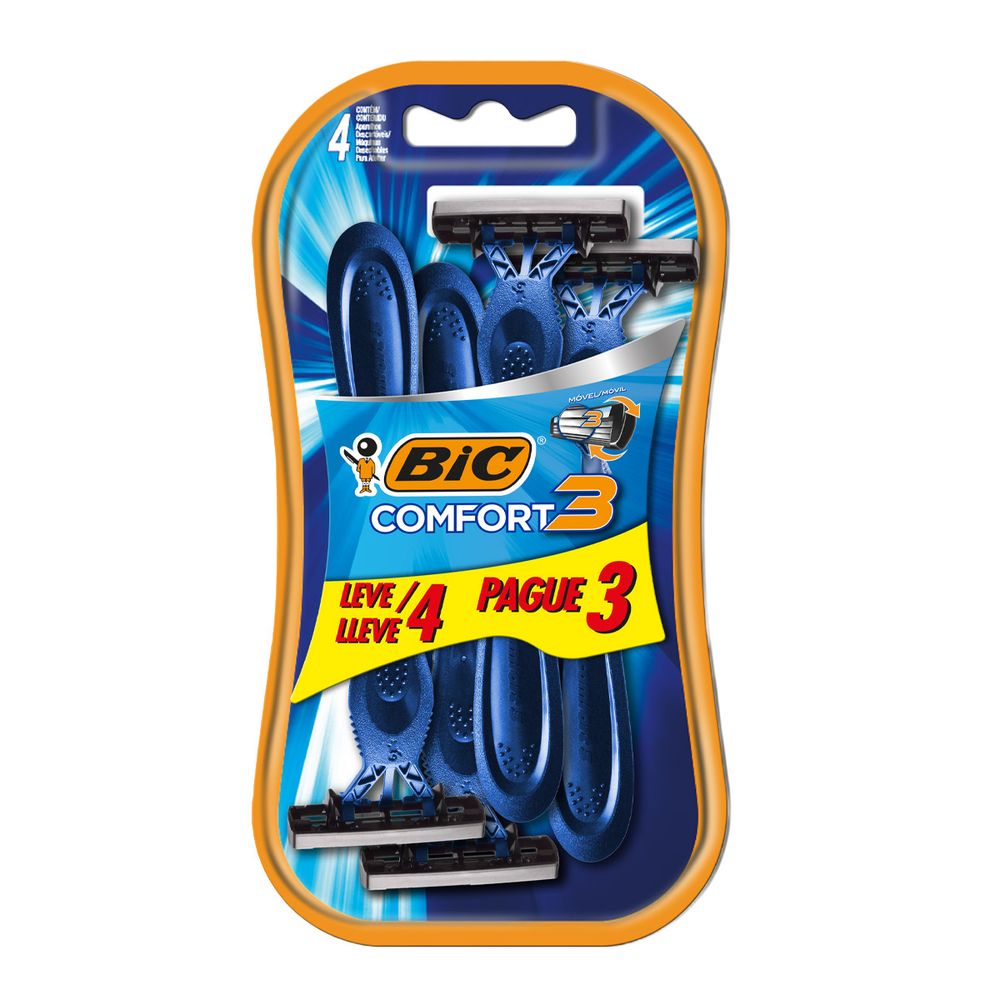 O Kit Aparelho de Barbear Bic Comfort 3 foi projetado para oferecer um barbear rente e suave. Com cabo ergonômico, cabeça móvel com fita lubrificante à base de lanolina e aloe vera, mais três lâminas afiadas, promove um barbear perfeito, sem cortes ou irritações na pele. Embalagem com 4 unidades.