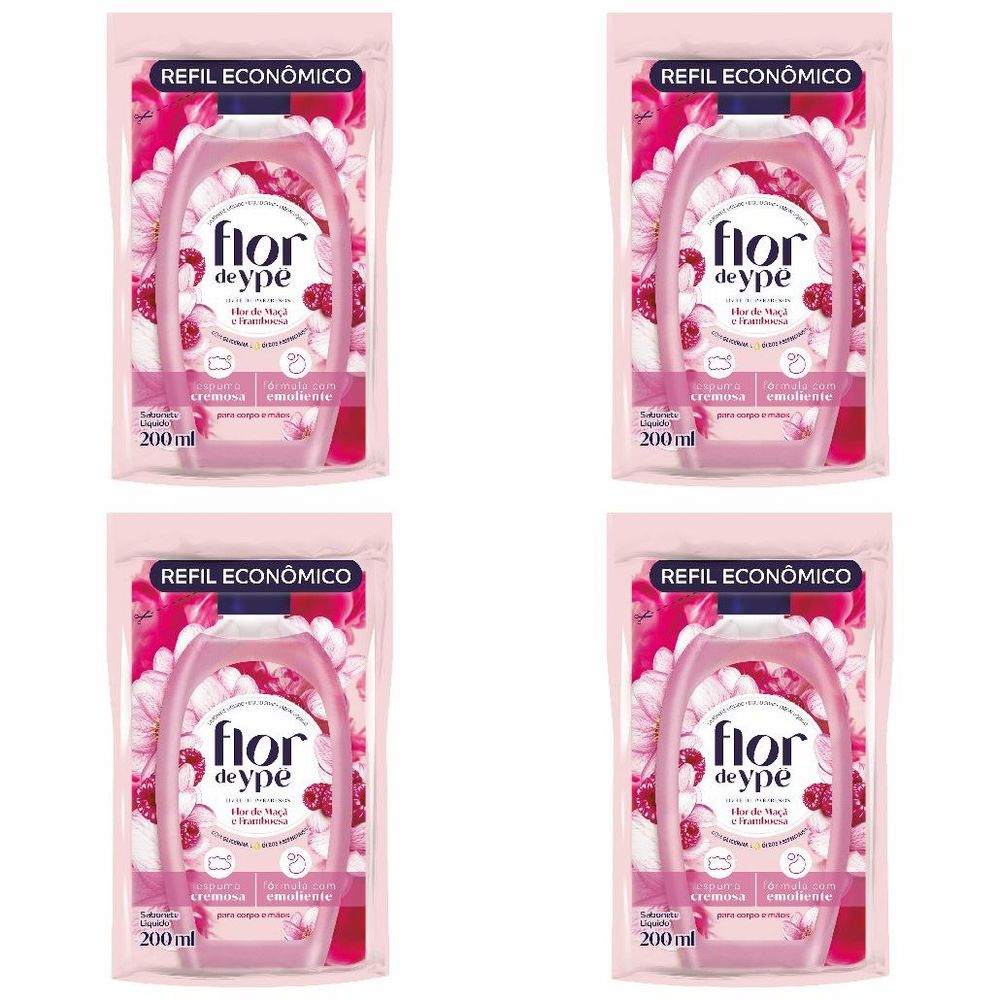 Kit c/4 Sabonetes Líquido Flor De Ype Refil 200ml Flor Macã /Framboesa