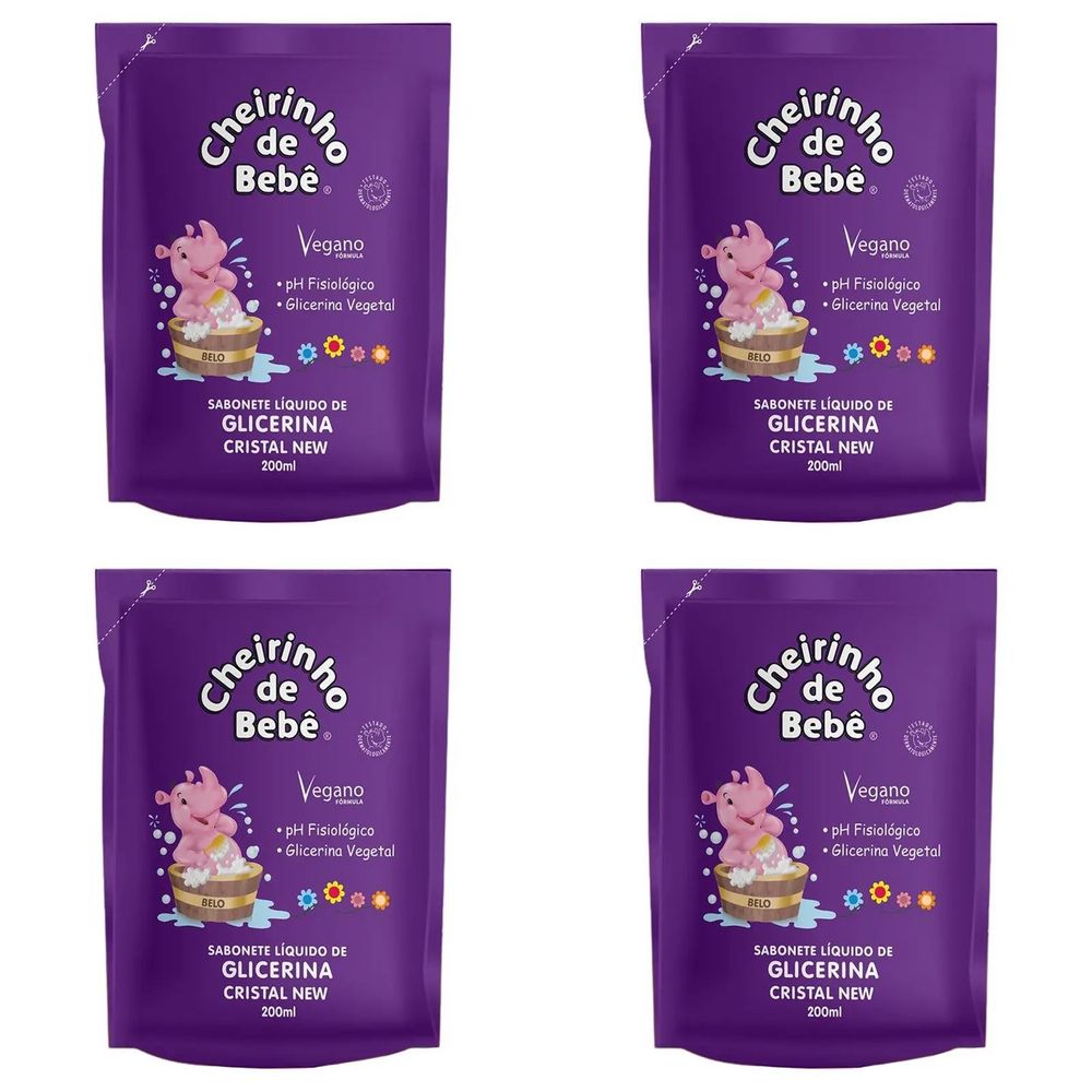 Kit c/4 Sabonetes Liquido Infantil Cheirinho De Bebê Refil 200ml Cristal