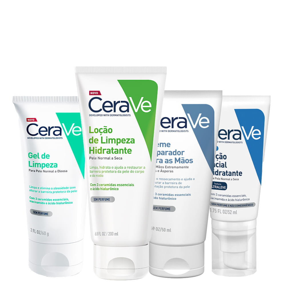 Com o Kit CeraVe garanta o cuidado ideal para a face e corpo. O Kit é composto por um Gel Facial de Limpeza ideal para peles mistas e oleosa, limpa profundamente, remove o excesso de oleosidade e refresca a pele sem remover sua proteção natural ou deixá-la ressecada e estirada. Loção de Limpeza Corporal que refresca e limpa a pele, sem remover sua proteção cutânea natural ou deixá-la ressecada e estirada e para garantir a hidratação diária do corpo, através de uma exclusiva tecnologia MVE, de liberação prolongada de ativos hidratantes possui também a Loção Hidratante Facial e o Creme de Reparação para as Mãos.
