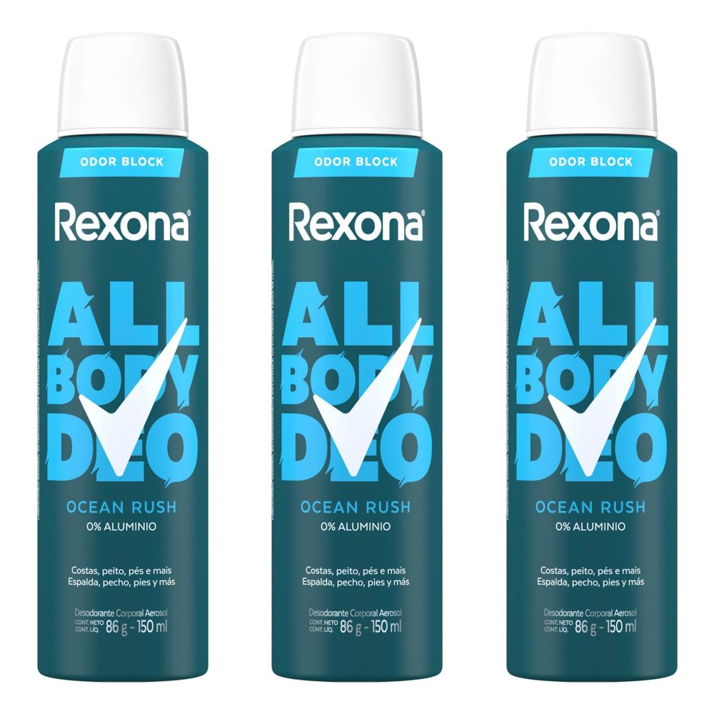 Kit com 3 Unidades de Desodorante Aerossol Rexona All Body Deo Ocean Rush 150ml
