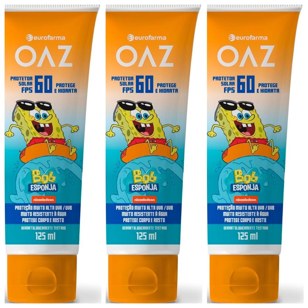 Kit com 3 Unidades de Protetor Solar Infantil Oaz Fps60 Bob Esponja 125Ml