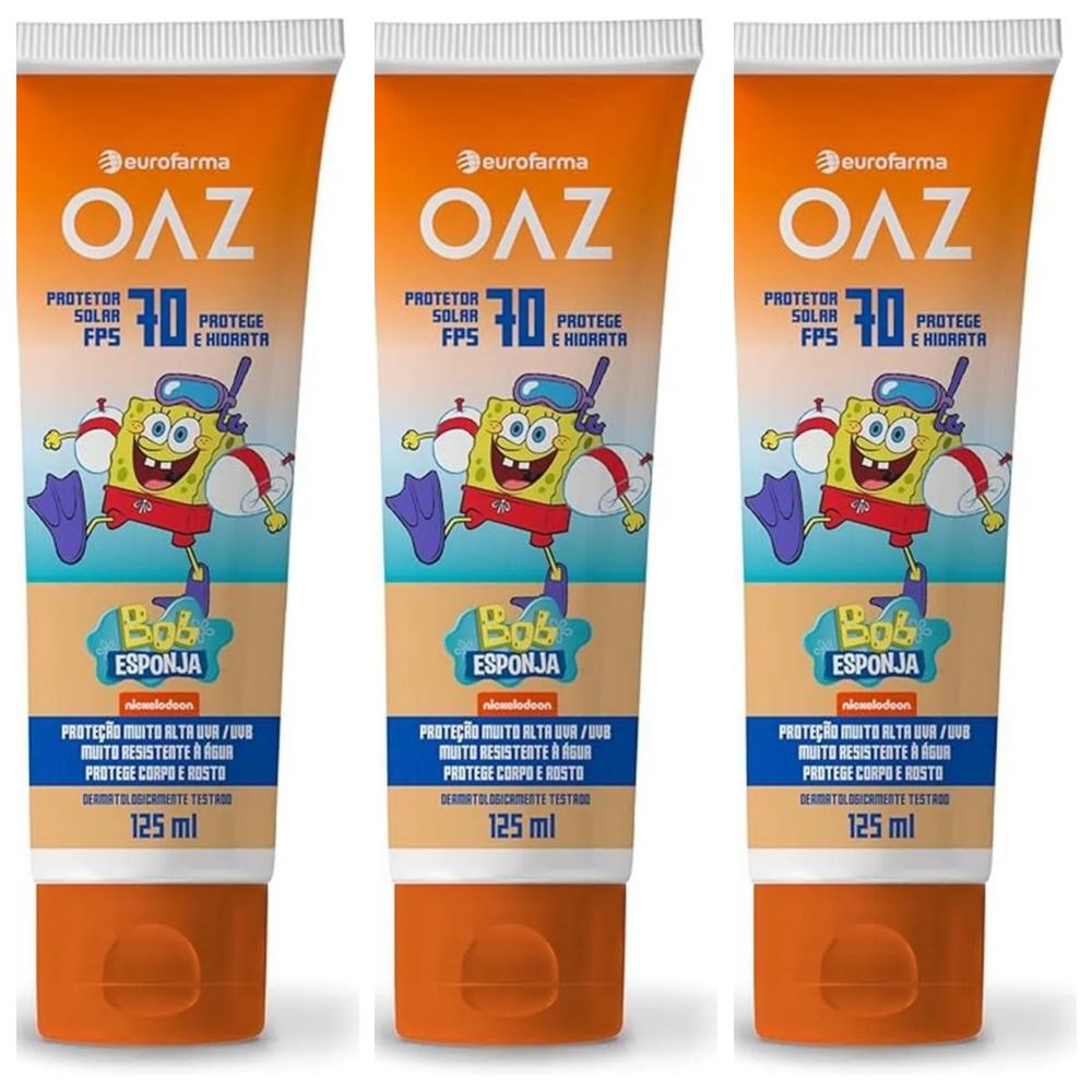 Kit com 3 Unidades de Protetor Solar Infantil Oaz FPS70 Bob Esponja 125ml
