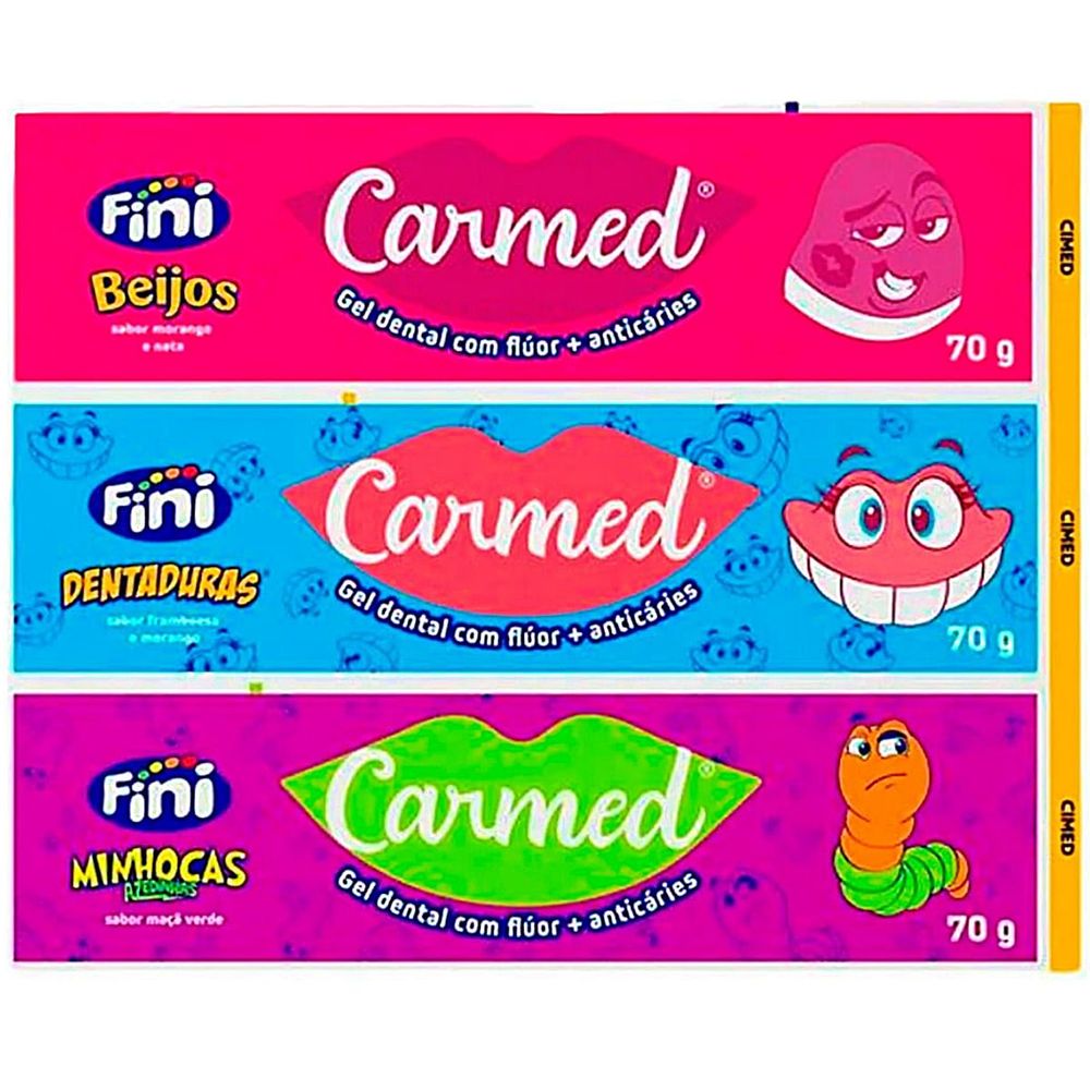 - Kit com 3 géis dentais Carmed Fini em sabores divertidos.