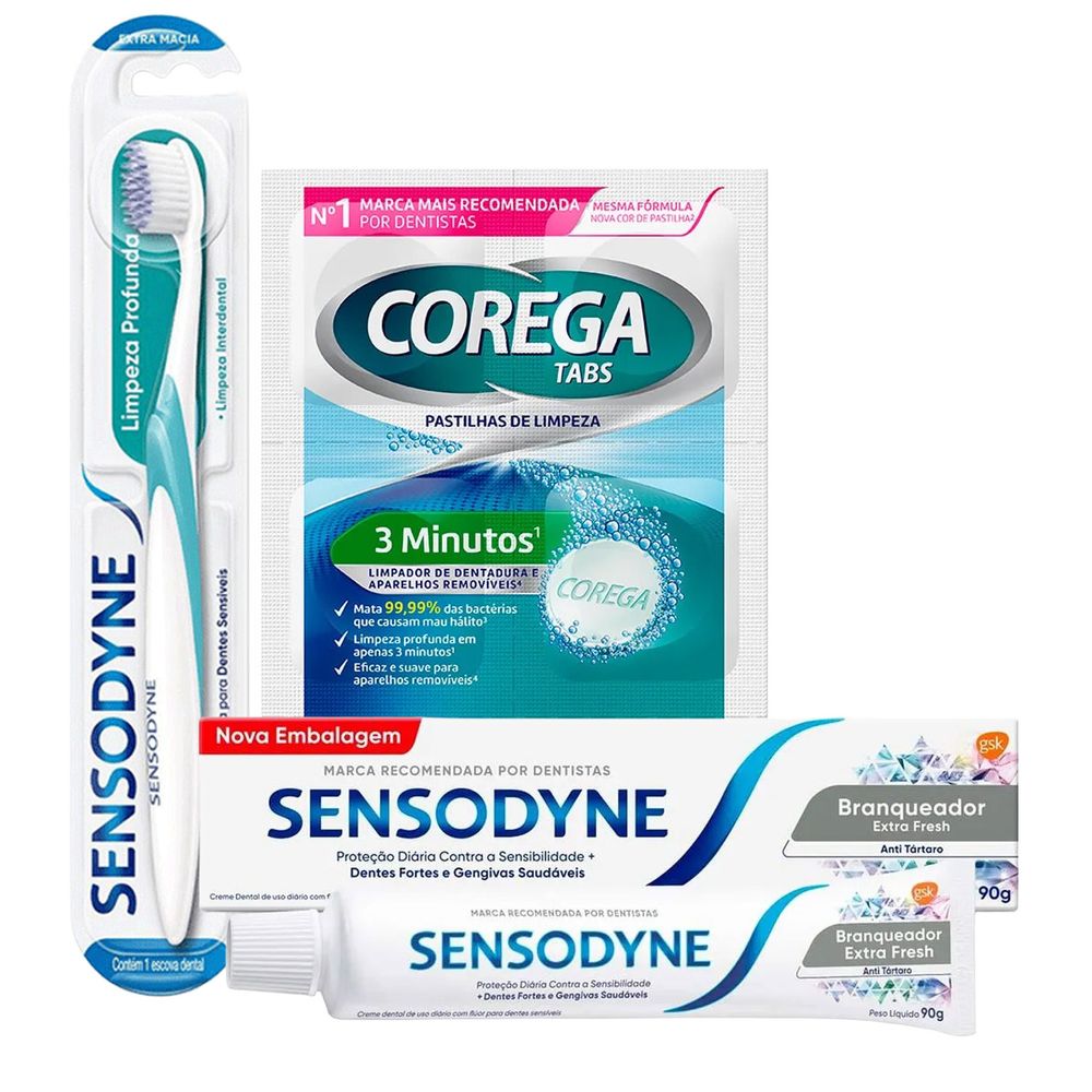 Kit Sensodyne Pasta de Dente Branqueador 90g + Escova Limpeza Profunda + Corega Tabs 3 Minutos 6 Pastilhas