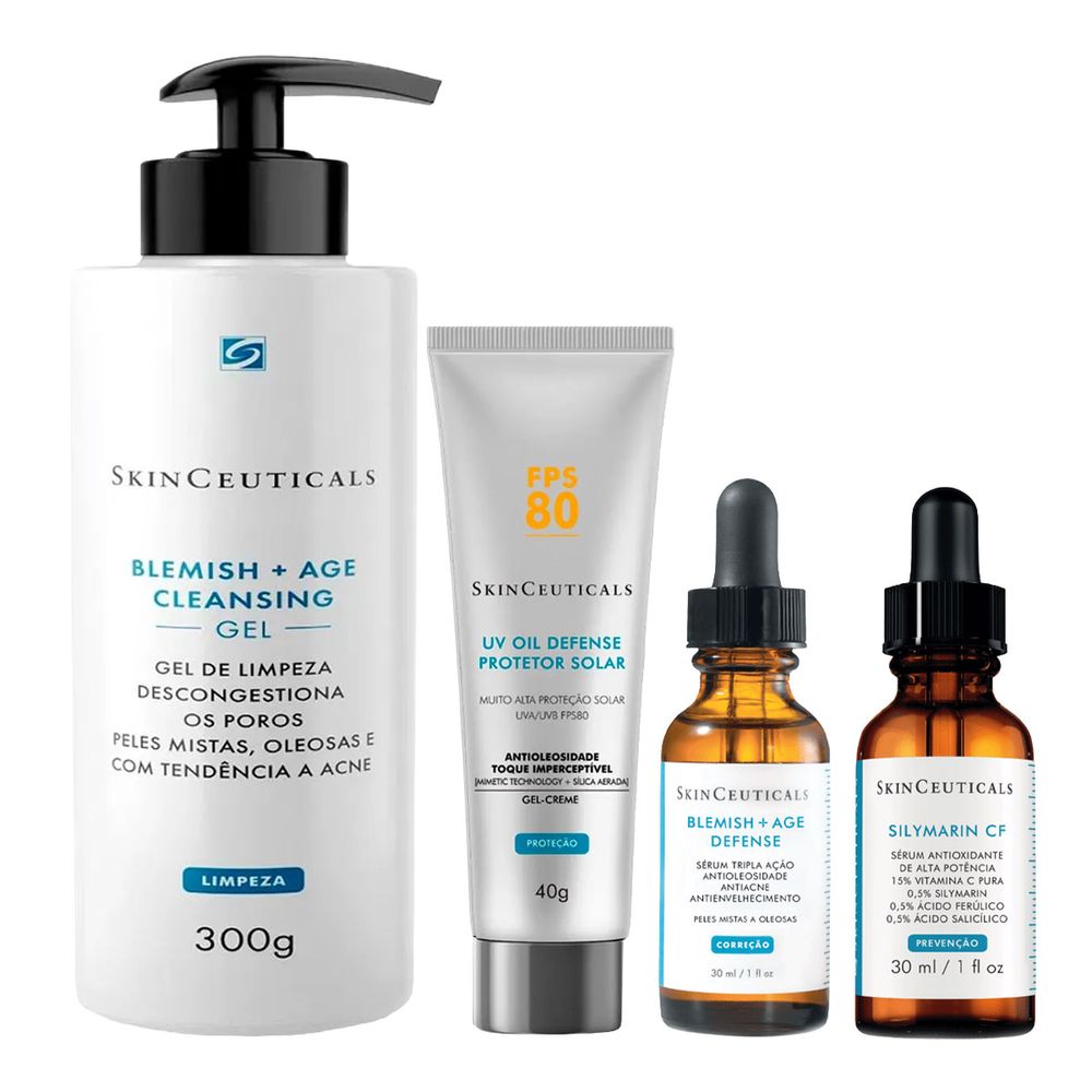 Kit Skinceuticals Gel de Limpeza 300g + Sérum Silymarin 30ml + Sérum Blemish Age Defense 30ml + Protetor Solar FPS 80 40g