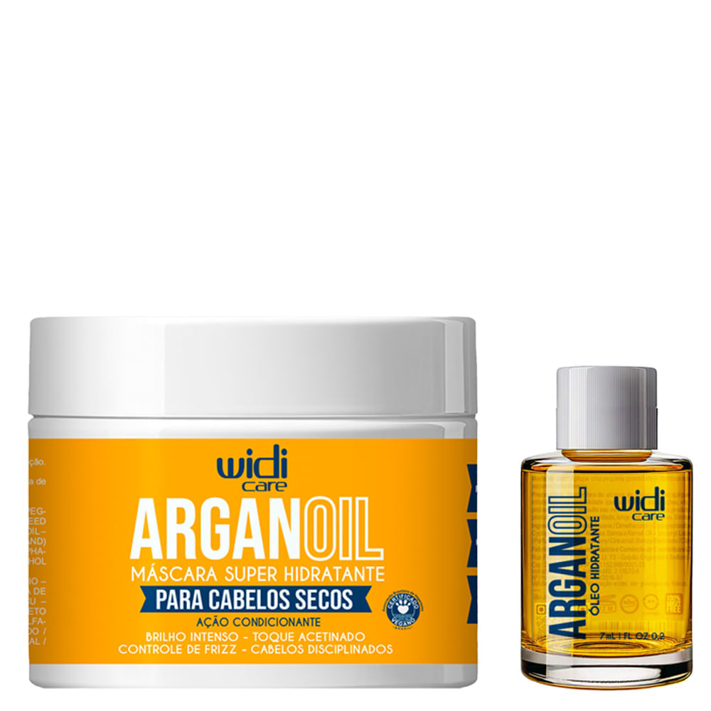 Kit Widi Care Argan Oil Super Hidratante Ação Condicionante Máscara 300g + Óleo 7ml – Hidratação Intensa, Controle do Frizz e Brilho EspelhadoKit indicado para cabelos secos, quebradiços e danificados, o Kit Widi Care Argan Oil Super Hidratante Ação Condicionante Máscara 300g e Óleo 7ml é um tratamento completo para hidratação profunda e finalização capilar, proporcionando brilho intenso, nutrição e proteção. A Máscara Super Hidratante oferece hidratação intensa e eficaz, devolvendo brilho e vitalidade aos fios, com uma textura "chantilly" que "desmancha" no cabelo. Já o Óleo Hidratante Argan Oil é um finalizador leve e de alta performance, que alinha os cabelos, controla o frizz e protege contra danos externos e térmicos. A linha é vegana, desenvolvida para uma rotina de beleza consciente e eficaz.Benefícios do Kit Widi Care Argan Oil Super HidratanteHidratação intensa e profunda para a fibra capilar, repondo a umidade e os nutrientes perdidos.Redução de até 90% do frizz, garantindo cabelos mais disciplinados e alinhados.Brilho espelhado e aumento de maciez e sedosidade dos fios.Proteção contra danos externos, como raios solares, vento, mar e calor de ferramentas térmicas.Rejuvenescimento capilar, combatendo o ressecamento e prevenindo o envelhecimento precoce dos fios.Restauração das pontas duplas, melhorando a aparência geral dos cabelos.Fortalecimento da estrutura da cutícula capilar, tornando os fios mais resistentes.Ação/Resultado dos AtivosÓleo de Argan: Atua como um potente antioxidante e hidratante, proporcionando brilho elevado e um cuidado extra para cabelos secos e quebradiços.Ácido Hialurônico: Garante alta hidratação, combatendo o ressecamento, promovendo a reposição e retenção da hidratação e rejuvenescendo os fios.Extrato de Pêssego: Ajuda a diminuir os danos causados por agentes externos, aumenta a hidratação e minimiza o frizz, além de ser um poderoso antioxidante e remineralizante.Como Usar o Kit Widi Care Argan Oil Super HidratanteApós lavar os cabelos, aplique uma quantidade generosa da Máscara Super Hidratante, mecha a mecha, garantindo a distribuição uniforme por toda a extensão dos fios.Deixe a máscara agir por um período de 5 a 10 minutos para que os ativos penetrem na fibra capilar.Enxágue completamente, removendo todo o produto dos cabelos.Com os cabelos úmidos ou secos, coloque uma pequena quantidade do Óleo Hidratante Argan Oil na palma das mãos.Distribua uniformemente o Óleo Hidratante pelo comprimento e pontas dos cabelos, sem a necessidade de enxaguar. Pode ser usado antes da escova para proteção térmica.Itens Inclusos: 1 Máscara Widi Care Argan Oil Super Hidratante 300g 1 Argan Oil Óleo Hidratante 7ml;Observações: Imagem Meramente Ilustrativa.;Gênero: Unissex;Linha: Argan Oil;Origem: Nacional;Público: Adulto;Sugestão de Uso: 1. Após lavar os cabelos, aplique uma quantidade generosa da Máscara Super Hidratante, mecha a mecha, garantindo a distribuição uniforme por toda a extensão dos fios. 2. Deixe a máscara agir por um período de 5 a 10 minutos para que os ativos penetrem na fibra capilar. 3. Enxágue completamente, removendo todo o produto dos cabelos. 3. Com os cabelos úmidos ou secos, coloque uma pequena quantidade do Óleo Hidratante Argan Oil na palma das mãos. 4. Distribua uniformemente o Óleo Hidratante pelo comprimento e pontas dos cabelos, sem a necessidade de enxaguar. Pode ser usado antes da escova para proteção térmica.;Precauções: Manter fora do alcance de crianças.;Utilização: Regular;Resultado Desejado: Hidratação;Categoria: Máscaras;Tipo de Cabelo: Normais ou Todos os Tipos;Benefícios PDP: