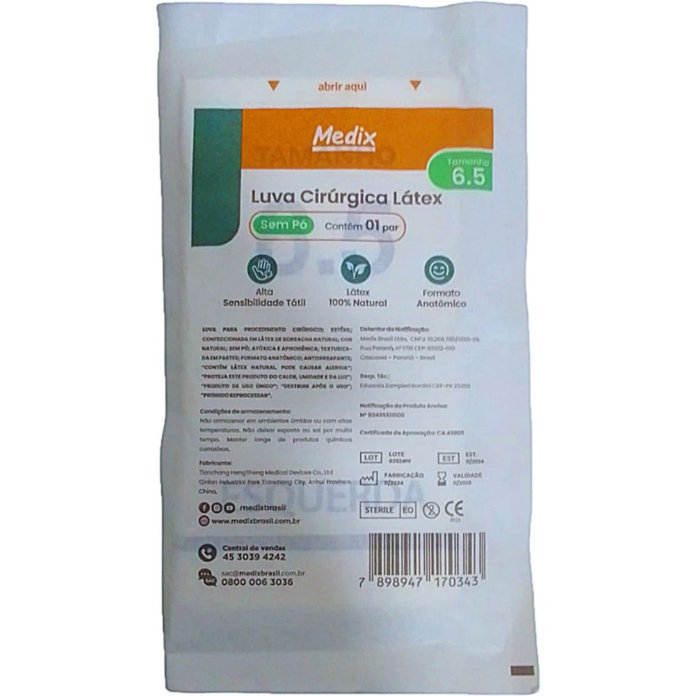 Luva Cirúrgica de Látex Medix - Sem Pó - 6.5 - Par