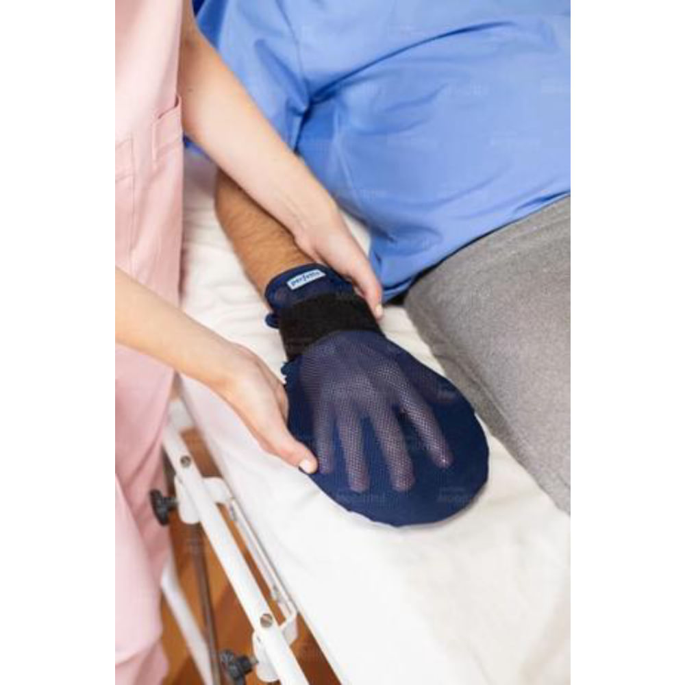 Perfeita para evitar que pacientes acamados arranquem sondas e cateteres. Possui espuma interna de alta densidade, que impede o paciente de dobrar a mão. Tecido telado respirável que permite ao cuidador visualizar a mão do paciente. Velcro de fixação e fechamento com zíper invertido. Base confortável que acompanha a anatomia da mão. Composição: Revestimento: 100% Poliéster. Medidas: 30cm x 18cm x 5cm