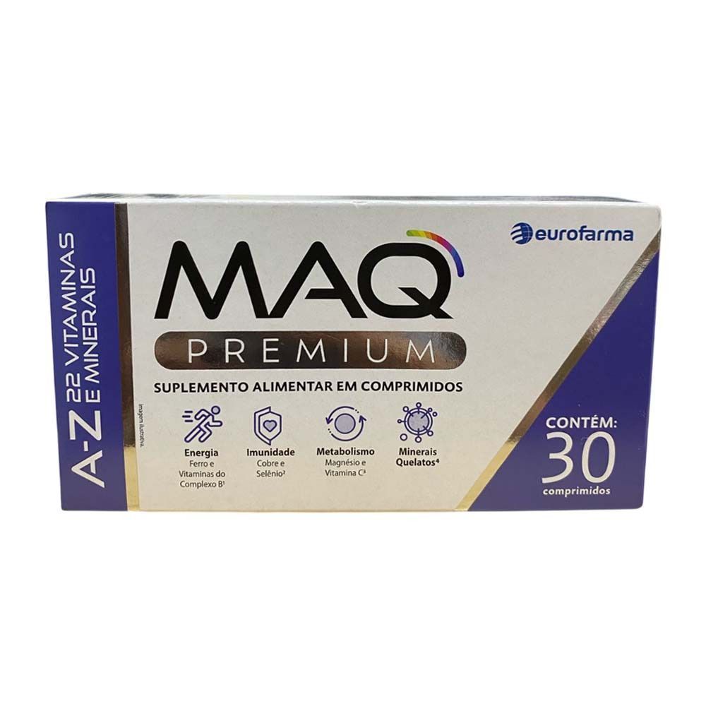 O MAQ Premium A-Z da Eurofarma é um suplemento alimentar avançado que combina 22 vitaminas e minerais essenciais, incluindo minerais aminoácidos quelatados produzidos com a tecnologia TRAACS®, garantindo alta biodisponibilidade e absorção eficaz. Ideal para homens e mulheres de diferentes faixas etárias, atua como coadjuvante alimentar em dietas irregulares ou deficientes, promovendo energia, disposição e suporte à imunidade.Indicação:Suplementação nutricional para auxiliar na manutenção da saúde geral.Modo de uso: Ingerir 2 comprimidos ao dia, preferencialmente junto às refeições. Informações adicionais: Não contém glúten nem lactose.Apresentação: Embalagem com 30 comprimidos.Recomendação de uso:Uso adulto. Ingerir 2 comprimidos ao dia.COMPOSIÇÃO:Cálcio, magnésio, ferro (Ferrochel®), zinco, selênio, cromo, vitaminas A, C, D, E, complexo B, entre outros nutrientes essenciais.