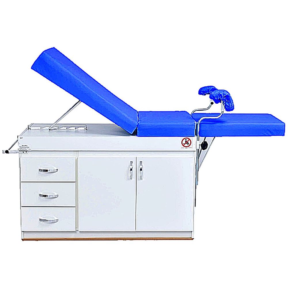 - ESTRUTURA: Fabricada em placa de fibra de média densidade (MDF) de espessura de 15 mm com revestimento melamínico de baixa pressão (BP), oferece gabinete com 2 portas e 3 gavetas para armazenamento de instrumental e materiais utilizados na realização dos exames.
