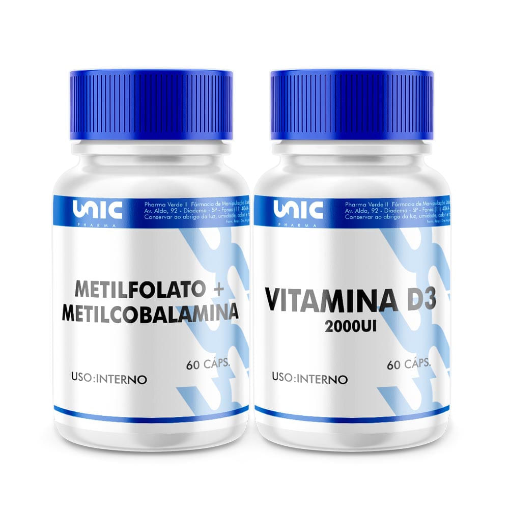 Kit com Vitaminas essenciais para a saúdeMeticobalamina mais metilfolatoVitaminas essenciais para a saúde agora em forma ATIVA!. Conheça mais sobre cada uma:Metilcobalamina é a forma ativa da Vitamina B12 mais biodisponível e melhor absorvida pelo organismo. Sua ação é de proteger o cérebro e prevenir transtornos neurológicos (Alzheimer, Parkison e Esclerose Múltipla), melhora a qualidade do sono e as funções cognitivas.Além disso, Metilcobalamina previne a anemia, tipos de leucemia, transtornos cardiovasculares como doenças de coração, trata o cansaço e a fadiga e ainda melhora a imunidade e inibe o desenvolvimento de tumores.A vitamina B12 ajuda a manter os níveis de energia, o sistema nervoso, função mental, cansaço e fadiga e o sistema imunitário, importante também para as mulheres grávidas e as pessoas com uma dieta vegana ou vegetariana.Metilfolato é a forma ativa do ácido fólico, que é melhor absorvida pelo organismo. Ele está presente em várias reações do organismo, incluindo a redução da hemocisteína, desintoxicação de muitas toxinas, produção de diversos neurotransmissores, além de ter papel fundamental na parte cognitiva, manutenção do humor e também atuar como coadjuvante no tratamento do câncer. Atua como antidepressivo e desintoxicante, reduz a ocorrência da deficiência do tubo neural e os níveis plasmáticos de homocisteína, além de auxiliar no tratamento de doenças cognitivas e distúrbios cardiovasculares.BenefíciosCuida do perfeito funcionamento do organismo (Indicação Principal);Protege o cérebro;Previne doença de Alzheimer, doença de Parkinson e esclerose múltipla;Melhora a qualidade do sono e concentração;Previne a anemia e tipos de leucemiaCombate transtornos cardiovasculares;Melhora a imunidade;Inibe o desenvolvimento de tumores.ComposiçãoMetilcobalamina com MetilfolatoPosologiaTomar 1 cápsula ao dia ou conforme a orientação de um profissional habilitado.Vitamina D3 2.000UIA Vitamina D3 conhecida por ser ativada com a exposição solar é uma importante suplementação para a saúde, uma vez que possui a ação de melhorar a absorção do cálcio no organismo, mantendo dessa forma a vitalidade dos ossos e dos dentes.Ajuda na mineralização dos ossos, previne raquitismo em crianças e a osteoporose em adultos.Auxilia na manutenção do sistema imunológico. Previne o diabetes e doenças cardiovasculares.Promove maior força e resistência aos músculos e reduz o risco de fraturas e quedas.benefíciosCuida da saúde óssea (Indicação Principal);Melhora o sistema imunológico;Aumenta a absorção do cálcio no organismo;Previne diabetes e doenças cardiovasculares.ComposiçãoViitamina D3 2.000ui com 60 cápsulasPosologiaTomar 01 cápsula ao dia ou conforme a recomendação de um profissional habilitado.Para que serve Metilfolato?Necessário para o corpo produzir e manter novas células, bem como a criação do DNA e RNA;Necessário para manutenção de níveis saudáveis de homocisteína; Desempenha papel importante na formação da SAM-e (s-adenosil metionina), composto que regula muitas funções inclusive o humor; Mulheres reduzem o risco de ter bebês com defeitos congênitos do cérebro ou medula espinhal.Quais os benefícios da Metilcobalamina?Metilcobalamina é indicada para aqueles que possuem deficiência de vitamina B12 no organismo, especialmente os idosos, ajudando a proteger contra o envelhecimento e doenças neurológicas que incluem Doença de Parkinson, distrofia muscular, esclerose múltipla e Doença de Alzheimer.Como tomar Metilfolato com Metilcobalamina e vitamina D3?Tomar uma cápsula ao dia.Quais os benefícios da Vitamina D3 2000UI?Ajuda na mineralização dos ossos, previne raquitismo em crianças e a osteoporose em adultos. Auxilia na manutenção do sistema imunológico. Previne o diabetes e doenças cardiovasculares. Promove maior força e resistência aos músculos e reduz o risco de fraturas e quedas.Onde comprar metilfolato com Metilcobalamina e vitamina D3?Só na Unicpharma você encontra o Composto Metifolato com metilcobalamina e Vitamina D3, com os melhores preços e as melhores condições.*Não se trata de propaganda, e sim de descrição do produto, consulte sempre um especialista. **Venda Sob prescrição de profissional habilitado, podendo este ser o nosso farmacêutico de acordo com a resolução 586/2013 do conselho de farmácia. Consulte-o. Sugestão de uso e benefícios desenvolvidos por profissional habilitado. Todo produto deste site possui dosagens dentro dos padrões usuais.Advertências* Estiver Grávida Ou Amamentando, Consulte Um Médico Antes De Usar Este Produto.* Mantenha Fora Do Alcance De Crianças. Guarde Em local frio e seco. * Não misturar esse medicamento com outro tipo de estimulante drogas ou bebida alcoólica.1. Nunca compre medicamento sem orientação de um profissional habilitado.2. Imagens meramente ilustrativas.s3. É recomendável uma dieta e exercícios físicos para auxiliar a redução de "peso".4. Pessoas com hipersensibilidade à substância não devem ingerir o produto. 5. Em caso de hipersensibilidade ao produto recomenda- se descontinuar o uso e consultar o médico.6. Não use o medicamento com o prazo de validade vencido.7. Manter em temperatura ambiente (15 a 30ºC). Proteger da luz do calor e da umidade. Nestas condições o medicamento se manterá próprio para o consumo respeitando o prazo de validade indicado na embalagem. 8. Todo medicamento deve ser mantido fora do alcance das crianças.9. Este medicamento não deve ser utilizado por mulheres grávidas sem orientação médica.10. Embora não existam contraindicações relativas a faixas etárias recomendamos a utilização do produto para pacientes de idade adulta.11. Siga corretamente o modo de usar. Não desaparecendo os sintomas procure orientação médica.12. O uso do medicamento durante o período de amamentação também não é recomendado.13. Este medicamen