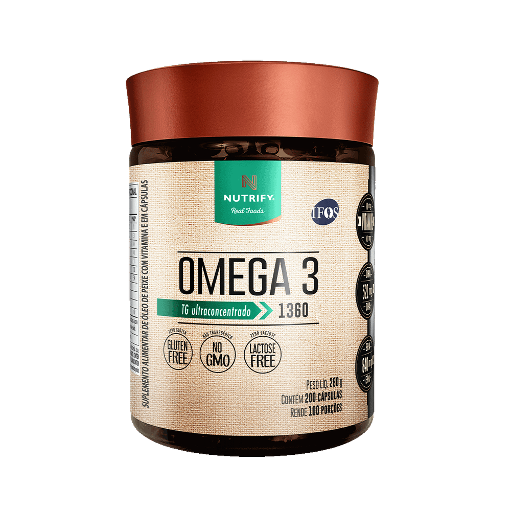 ;Indicado Para: Imunidade;Indicado Para: Saúde Mental;Claim Prateleira: claim-gluten-free.png|claim-lactose-free.png|claim-no-gmo.png;Conteúdo Especial: 10mg Vitamin E;Conteúdo Especial: 521mg DHA;Conteúdo Especial: 840mg EPA;Claim Inferior: Gluten Free;Claim Inferior: Lactose Free;Claim Inferior: No GMO;Benefícios do Produto: • Atua como anti-inflamatório • Auxilia no controle dos níveis de colesterol • Participa do bom funcionamento do cérebro • Auxilia na regulação da pressão arterial;Para que serve: Encontrado especialmente no óleo de peixe ou em algumas sementes como a chia, o Ômega-3 é uma gordura boa que carrega diversos benefícios estudados pela ciência. Além de atuar como anti-inflamatório, controlando os níveis de colesterol do organismo, o Ômega 3 Nutrify atua no bom funcionamento do cérebro, mais especificamente, da memória. Entre os seus inúmeros benefícios, esse ácido graxo é essencial para regular a pressão arterial e participa no recobrimento da retina, sendo importante para a visão.;Como e quando tomar: Muito importante para o organismo, o Ômega-3 é uma gordura que o ser humano não é capaz de produzir, sendo assim, ele deve ser consumido via suplementação ou alimentação. Por isso, sugerimos a ingestão de 2 cápsulas de Ômega 3 Nutrify por dia com as principais refeições ou conforme prescrição médica ou nutricionista. Quando unido com hábitos saudáveis, a alta concentração de EPA e DHA mantém saudáveis os níveis de triglicerídeos do organismo.;Destaques: • Super Concentrado • Conta com selo IFOS, que comprova a concentração do produto, a ausência de metais pesados, a oxidação, a pureza e a estabilidade • 840 mg de EPA • 521 mg de DHA;cores-beneficios: #E99251;pra-que-serve-banner: https://nutrifysaude.vtexassets.com/assets/vtex.file-manager-graphql/images/5b4315fd-6311-4d18-91a2-491b55347218___ec00e6a8aeaed311d8ce56fc08c20bed.webp;como-tomar-imagem: https://nutrifysaude.vtexassets.com/assets/vtex.file-manager-graphql/images/80633236-ef58-4d1a-b494-3bc5a643fe48___290660cc5a0bfb3889a6dcc887645010.webp;Valor Desconto Minimo: https://nutrifysaude.vtexassets.com/assets/vtex.file-manager-graphql/images/e0b821ec-b88e-414f-8392-df71f69e4772___9597769c349b665eaa3f667406546ded.webp;beneficios-titulo: Conheça o Ômega 3 Nutrify;beneficios-texto: **Alta concentração para expandir benefícios** O Ômega 3 Nutrify é essencial para quem busca saúde e bem-estar em todos os momentos! Este poderoso ácido graxo, que o corpo não produz sozinho, é indispensável para o coração, o cérebro e a visão. Rico em qualidade e praticidade, ele oferece os benefícios encontrados em peixes de águas frias, sementes e nozes, garantindo o suporte ideal para a sua saúde. Cuide de você com o melhor do Ômega 3!;items-beneficios: [ "https://nutrifysaude.vtexassets.com/assets/vtex.file-manager-graphql/images/2bd427cb-47bb-4d91-82b1-15e206da51af___2ef90ce486cc31eff0ab2d2c78122caa.svg; **O que são Triglicerídeos (TG)?** Quando o ômega-3 está na forma de triglicerídeos (TG), ou seja, na mesma forma em que é encontrado na natureza, torna-se mais fácil para o organismo reconhecê-lo e utilizá-lo. Isso otimiza seu aproveitamento e benefícios para a saúde." , "https://nutrifysaude.vtexassets.com/assets/vtex.file-manager-graphql/images/71586965-dc16-4d2b-9cd3-bd5de6635c35___33abc01e5c8b18d9fe580261841dc845.svg;**EPA E DHA** Os ácidos graxos ômega-3 são fundamentais para o organismo, compondo as membranas celulares e garantindo sua funcionalidade. No cérebro, o DHA representa 20% das gorduras, sendo essencial para a saúde neurológica. Além disso, auxiliam no controle da inflamação e beneficiam o sistema circulatório, promovendo equilíbrio e saúde." ];background-beneficios-m: https://nutrifyexperthub.vtexassets.com/assets/vtex.file-manager-graphql/images/516907e4-28fd-4efd-a0fa-01f3c7f5e65e___9c14a8188eacf6daf143609a153045ca.webp;background-beneficios-d: https://nutrifyexperthub.vtexassets.com/assets/vtex.file-manager-graphql/images/afa84382-af85-474a-9f1f-f90ff3396bdc___279b9a68d07c6bc0f99b77b3fc06e561.webp;titulo-descricao-tabela: Como escolher o melhor Ômega-3?;descricao-tabela: Na busca pelo ômega-3 ideal, considere os seguintes critérios para tomar uma decisão informada: Alta Concentração de EPA e DHA: Opte por um ômega-3 com altas concentrações de EPA e DHA por cápsula. Pureza e Procedência: Verifique a procedência da matéria-prima. Certificações que atestam a pureza do produto são fundamentais. O selo IFOS é um indicador confiável nesse aspecto. Absorção Eficiente: Escolha um ômega-3 que seja facilmente absorvido pelo organismo. A qualidade da fonte e a forma de apresentação (triglicerídeos, por exemplo) influenciam na absorção.;descricao-tabela-background-d: https://nutrifyexperthub.vtexassets.com/assets/vtex.file-manager-graphql/images/6b90ccfa-e6e5-449b-a0d3-d99377ea9707___8bc613485b3ef2775153445a98019326.webp;descricao-tabela-background-m: https://nutrifyexperthub.vtexassets.com/assets/vtex.file-manager-graphql/images/8d615302-6d5d-47f9-81d9-0c945e8d5e38___1b5a1a72fb72d70e71499f9cb2aebd1a.webp;texto-complementar: Ômega 3 Nutrify é formulado com óleo de peixe de altíssimo grau de pureza e concentração. Oferece o nutriente na sua forma de triglicerídeos - a mais biodisponível. Poucos óleos no mundo são tão concentrados: fornece 840 mg de EPA e 521 mg de DHA em apenas duas cápsulas. Certificado pelo IFOS, em virtude de sua qualidade, pureza, segurança e ausência de metais pesados.;texto-como-quando: O ômega 3 da Nutrify pode ser consumido **em diferentes momentos do dia**, mas a recomendação mais comum é tomá-lo junto com as principais refeições, como almoço ou jantar. Isso favorece a absorção dos ácidos graxos, já que o consumo com alimentos ricos em gordura auxilia no aproveitamento dos nutrientes. **Quantas cápsulas de ômega 3 devo tomar por dia?** 