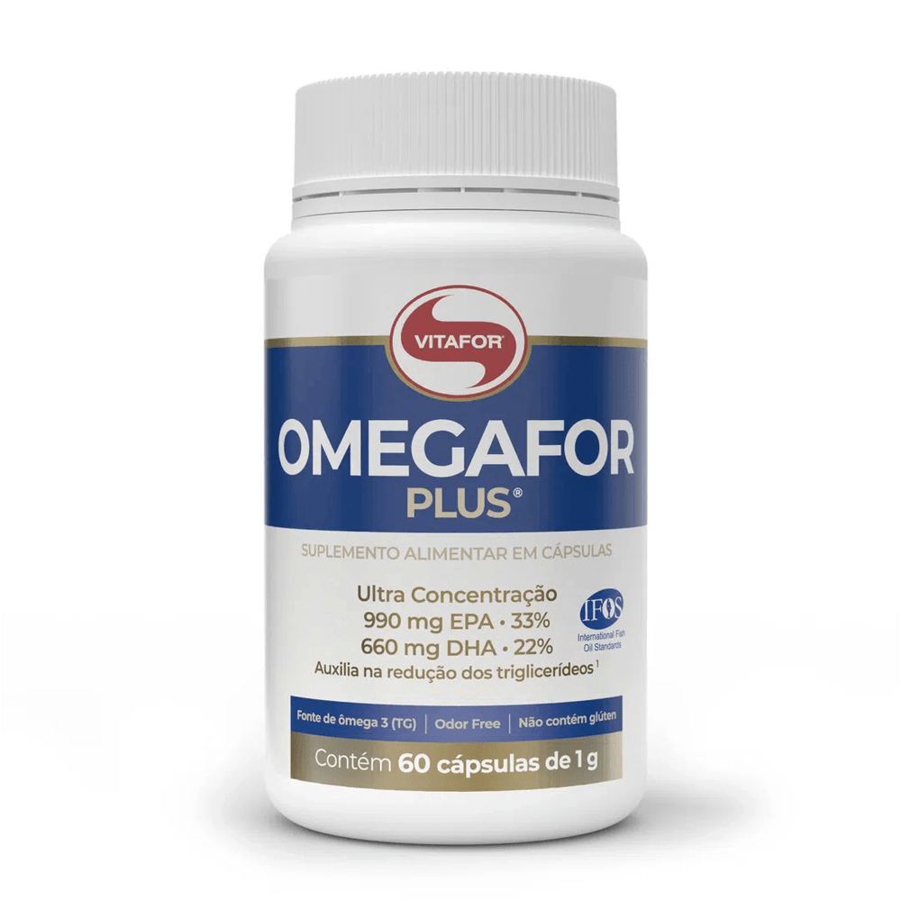 Ômegafor Plus da Vitafor: O Suplemento de Ômega 3 Ultra Concentrado para um Coração e Cérebro SaudáveisO Ômegafor Plus da Vitafor é um suplemento alimentar formulado com óleo de peixe ultra concentrado, proporcionando uma dose recomendada de 990mg de EPA e 660mg de DHA por porção.A saúde do seu cérebro e coração é fundamental. Ao longo dos anos, nossos hábitos alimentares mudaram significativamente, com um aumento no consumo de açúcar, gorduras e alimentos com baixo valor nutricional. Infelizmente, muitos alimentos ricos em nutrientes essenciais para o corpo humano são deixados de lado em nossa rotina.Os efeitos dessa alimentação desequilibrada podem ser vistos em exames médicos, como altos níveis de colesterol e triglicerídeos, que são apenas dois exemplos dos problemas decorrentes da má nutrição. Esses problemas podem afetar negativamente o funcionamento adequado do coração.O ômega 3 é composto pelos ácidos graxos EPA e DHA. O EPA é um ácido graxo essencial conhecido por sua ação no sistema cardiovascular, enquanto o DHA é essencial para o sistema cognitivo.Normalmente, obtemos ácidos graxos ômega 3 por meio da dieta, principalmente de peixes e frutos do mar. No entanto, quando esses alimentos não estão presentes em quantidade suficiente em nossa dieta ou em momentos como a gestação, a suplementação pode ser uma solução viável.O Omegafor Plus é apresentado na forma de triglicerídeos (TG), o que facilita a absorção pelo corpo. É um produto Premium que atende aos mais altos padrões de pureza, potência e frescor em todo o mundo, graças à certificação IFOS presente em toda a linha de ômegas Vitafor.Ao optar pelo Ômega 3 EPA DHA ou pelo Ômegafor Plus, você estará consumindo uma dose de 540mg de EPA e 360mg de DHA. No caso do Ômegafor Plus, a formulação oferece uma alta concentração de ácidos graxos ômega 3, com 990mg de EPA e 660mg de DHA por porção.Cada indivíduo é único, e é por isso que oferecemos diferentes concentrações na família de ômegas, para atender às necessidades individuais e às dosagens recomendadas por profissionais de saúde.Benefícios do consumo de Ômegafor PlusEstudos científicos demonstram múltiplos benefícios para a saúde com a suplementação de ômega 3. O ômega 3 auxilia na redução dos triglicerídeos.Atenção: Alguns peixes estão contaminados por metais pesados que são lançados nas águas. Ao consumir peixes contaminados, você também está ingerindo esses metais pesados, o que pode comprometer sua saúde. Ao escolher seu suplemento de ômega 3, é essencial procurar por produtos puros e livres de metais pesados. O Ômegafor Plus possui a certificação internacional IFOS™, que garante a pureza do produto e sua isenção de metais pesados.Diferenciais do Ômegafor Plus-Certificação do Programa Internacional de Padrões de Óleo de Peixe (IFOS™). - Único programa de testes e certificação de terceiros para óleos de peixe. - Selo de Qualidade VLabor. - Fonte de ômega 3 em forma de triglicerídeos para uma absorção maior e conforto gástrico. - Extraído de águas frias e profundas de regiões polares. - Alta concentração dos derivados de ômega 3: 990 mg de EPA (ácido icosapentaenóico) e 660 mg de DHA (ácido docosahexaenóico). - Livre de odor. - Invista no Ômegafor Plus da Vitafor e promova a saúde do seu coração e cérebro. Cuide de si mesmo com um suplemento de alta qualidade, pureza e potência.Apresentação: 60 Cápsulas gelatinosa.;Recomendações de uso: Suplemento alimentar de uso adulto (a partir de 19 anos de idade): ingerir 4,5g (3 cápsulas), ao dia antes das refeições ou seguir a recomendação de um profissional da saúde.;Composição: Óleo de peixe. Composição da cápsula: gelatina, água e umectante glicerina. NÃO CONTÉM GLÚTEN.;PBM: 24 meses após data de fabricação.;Conservação: Manter o produto bem fechado e conservar ao abrigo da luz, calor, odor e umidade. Não utilize o produto caso a embalagem esteja violada. Após aberto, consumir preferencialmente em até 60 dias.;Local de Venda: Frasco com lacre térmico de proteção.;Requisitos de Segurança: Este produto não deve ser consumido por gestante, lactantes e crianças. Não exceder a recomendação diária de consumo indicada na embalagem. Mantenha fora do alcance de crianças. Este produto não é um medicamento.;