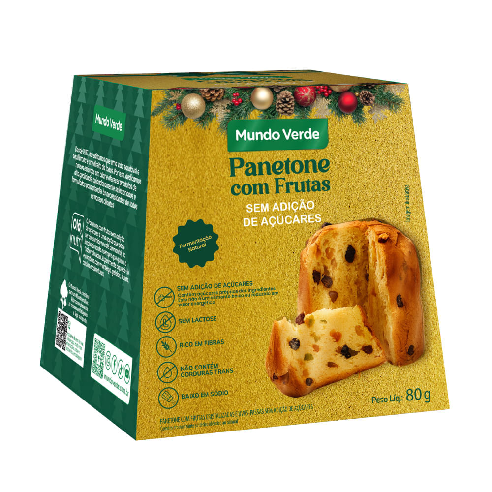 O Panetone com frutas zero açúcar Mundo Verde é um panetone sem adição de açúcar, sem lactose produzido com muitas frutas cristalizadas. Produzido através de fermentação natural possui uma textura macia e leve, ideal para quem é apaixonado por essa delícia tão tradicional, mas possui restrição ao consumo de açúcares.
