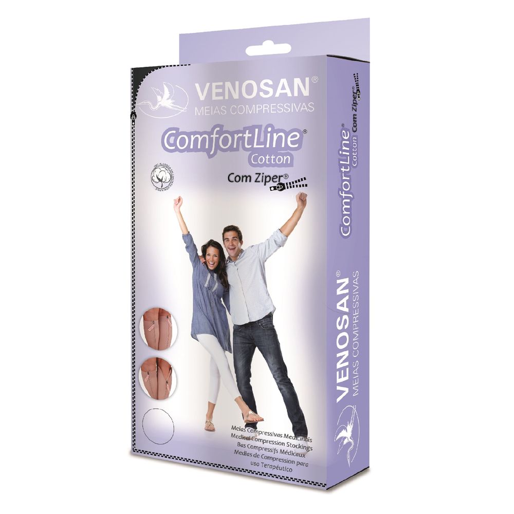 A Venosan Brasil lança no mercado a Comfortline Cotton com Zíper, produzida com a garantia de qualidade Suíça que a Venosan imprime em todos os seus produtos. Utilizando as melhores matérias primas, alta tecnologia e inovação, mantendo o mais alto padrão de qualidade com o compromisso de sempre entregar para o consumidor o melhor.Produzida com tecnologia sofisticada, a partir de elastano de última geração com duplo recobrimento, a Comfortline Cotton com Zíper conta com um design moderno, confortável e de fácil calçar, devido ao zíper localizado na parte de trás, que facilita vestir e tira-las, diferenciando-a dos outros modelos disponíveis no mercado. Elaborada para atender um público que possui certa dificuldade no calçar, como idosos, pessoas acamadas, pós operadas e ou com dificuldade de locomoção. A Comfortline Cotton com Zíper oferece excelente custo-benefício, garantindo ao paciente conforto, durabilidade e a eficácia no tratamento.Devido ao seu design criado para auxiliar no fechamento do zíper, facilitando o calçar, a Comfortline Cotton com Zíper, possui um puxador longo e resistente e uma proteção interna de tecido que evita que o zíper entre em contato com a pele, oferecendo mais conforto ao paciente.Realmente uma meia pensada para facilitar a adesão do paciente que possui grande dificuldade em aderir a um tratamento de terapia de elasto compressão. Auxilia na diminuição dos inchaços e dores nas pernas.Disponível em 5 tamanhos, nos comprimentos curto e longo, a Comfortline Cotton com zíper veste dos tamanhos P ao XXG, no modelo ¾, cor bege, compressão 20-30mmHg e é unissex para homens e mulheres.A Comfortline Cotton com Zíper é uma exclusividade Venosan! CARACTERÍSTICAS: Projetada para aumentar a circulação sanguínea e reduzir o inchaço Média compressão. 20-30mmHg Compressão graduada Zíper na parte de trás. Rápido e prático de vestir. Confortável de usar Ideal para o dia-a-dia Design com a ponta dos dedos dos pés abertas Costuras resistentes e de grande durabilidade Firmeza e conforto para longos períodos em pé ou sentado e até para viagens longas Ideal para usar com saltos altos, durante o trabalho e até nos treinos Unissex: para homens e mulheres Tecido com maior índice de rigidez Um par (2 unidades): na cor Bege Disponível em 5 tamanhos: veste do P ao XXG Comprimento curto e longo INDICAÇÕES 20 - 30 mmHg Média compressão Sensação de peso e fadiga nas pernas Varizes durante a gravidez Varizes com tendência para edema Após escleroterapia de pequenas veias