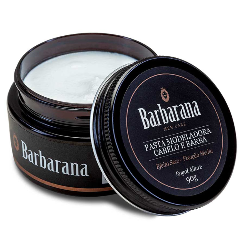 Pomada Modeladora para Cabelo e Barba - 90g Efeito Matte (seco/natural), Fixação Média (Medium Hold) Use a Pomada Modeladora Barbarana nos cabelos e barba para controlar os fios, deixando-os soltos, sem pesar. Sua fixação média e sem brilho protege seus cabelos da umidade e do frizz durante todo o dia, mantendo-os sob controle. Textura: Creme  Características: Efeito Matte (seco/natural).Fixação média.Ajuda a modelar e controlar os fios rebeldes , deixando-os soltos, sem pesar.Hidrata e fortalece os fios capilares.Fórmula não oleosa, a base de água. Rápida absorção, não deixa resíduos e sai fácil no banho.Ação Térmica (protege os fios na utilização do secador)Ativos Naturais: Cera de Abelha – Possui ação hidratante e é capaz de formar uma barreira protetora na pele e nos fios capilares, protegendo-os contra as ações de agentes externos. Ação modeladora e anti frizz. Extrato de Aloe Vera – Nutri profundamente e estimula o crescimento natural dos fios capilares, proporcionando cabelos fortes, bem hidratados e saudáveis.