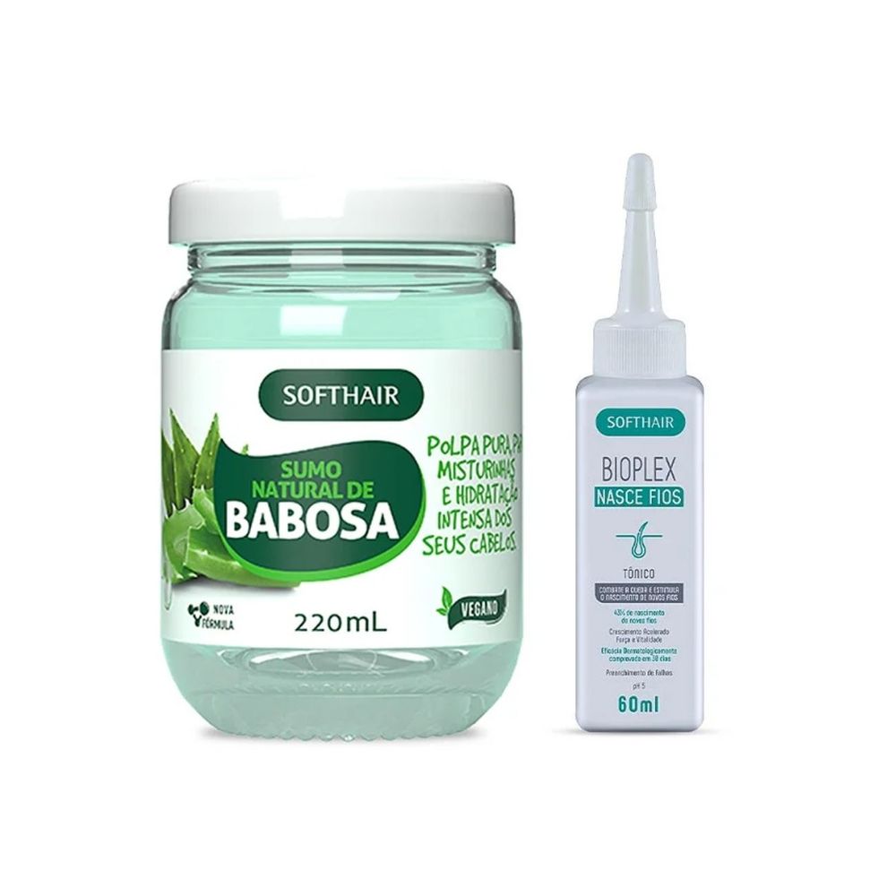 Kit contendo:1 Pote de Sumo de Babosa Soft Hair 220ml1 Frasco de Bioplex Nasce Fios Soft Hair 60mlSobre o Kit!Promova o crescimento capilar saudável com o poderoso Kit da Soft Hair com Tônico de Crescimento Capilar Bioplex Nasce Fios e Sumo Polpa de Babosa! Descubra a solução para seus problemas de queda de cabelo e fios enfraquecidos. Os produtos da Soft Hair são formulados com ingredientes cuidadosamente selecionados para estimular o crescimento dos cabelos, fortalecer as raízes e proporcionar um aspecto volumoso e radiante.O Tônico de Crescimento Capilar Bioplex Nasce FIos é enriquecido com uma combinação única de Biotina, Cafeína, Vitaminas do Complexo B e nutrientes revitalizantes. Essa fórmula exclusiva penetra profundamente no couro cabeludo, nutrindo os folículos capilares e estimulando o crescimento saudável dos fios. Com o uso regular, você notará uma redução da queda de cabelo e uma melhoria visível na textura e na espessura dos fios.Além disso, a Polpa de Babosa é conhecida por suas propriedades regenerativas, sendo um complemento perfeito para o tratamento capilar. Esse suco naturalmente rico em vitaminas e minerais age como um hidratante intensivo, nutrindo e fortalecendo os cabelos da raiz até as pontas. Com sua ação calmante, a babosa também ajuda a reduzir a coceira e a irritação do couro cabeludo.Recupere a confiança em sua aparência e desfrute de cabelos saudáveis e radiantes!Veja a seguir as informações de cada produto individualmente:—-------------------------Sumo Natural de Babosa Soft Hair 220mlO Sumo de babosa ou Polpa de Aloe e Vera é um elixir poderoso que tem sido usado há séculos para promover o crescimento capilar saudável. Com sua alta concentração de vitaminas, minerais e enzimas, ele nutre profundamente o couro cabeludo, estimula os folículos pilosos e ajuda a prevenir a queda de cabelo.A fórmula exclusiva do Sumo Natural de Babosa da Soft Hair é cuidadosamente extraída das folhas da planta, garantindo a máxima pureza e eficácia. Cada gota contém ingredientes naturais que ajudam a reparar os danos causados pelo uso excessivo de produtos químicos, calor e styling, deixando seu cabelo macio, sedoso e brilhante.Ideal para misturinhas e super hidratação! A embalagem de pote de vidro é conveniente e fácil de usar. Basta misturar o sumo ao creme de preferência e seguir o cronograma capilar ou até mesmo usar sozinho diretamente nos fios.Principais Benefícios:Ideal para misturas com cremesHidratação poderosa aos fiosAuxilia na produção de colágenoAuxilia no controle a oleosidade excessiva do fioCabelos soltos, macios e com brilho intensoProduto VeganoANVISAProcesso: 25351.680250/2018-06 AUT/MS 2.01236.1Modo de usar:Seu uso pode ser feito sozinho no cabelo ou misturado a cremes e máscaras para potencializar o resultado.—------------------Tônico Bioplex Nasce Fios Soft Hair 60mlSe você está procurando um tônico para estimular o crescimento dos seus cabelos, está no produto certo! O Tônico Bioplex Nasce Fios é especializado e formulado para promover o crescimento saudável dos fios, proporcionando resultados visíveis e duradouros. Combinando ingredientes de alta qualidade o Bioplex Nasce Fios é a escolha ideal para quem deseja cabelos mais volumosos e fortes.A fórmula exclusiva contém uma combinação poderosa de Biotina, Cafeína, Vitaminas do Complexo B e nutrientes revitalizantes. Esses ingredientes trabalham em sinergia para nutrir os folículos capilares, proporcionando força, resistência, elasticidade e saúde aos fios de dentro para fora. Além disso, age diretamente no couro cabeludo, penetrando, e reativando o funcionamento dos bulbos existentes. Ajuda a preencher falhas causadas por perda e queda dos fios, eliminando fraqueza, quebra e ressecamento excessivo dos cabelos.E o melhor! Não possui efeito vasodilatador e não altera o metabolismo do organismo.Age diretamente na reversão dos principais tipos de perda de cabelos:Perda frontal (entradas) | Perda de zona superior (coroa) | Perda Geral e afinamento dos fios | Cabelos ralos.ANVISAProcesso: 25351.194431/2018-14 AUT/MS 2.01236.1Modo de usoCom os cabelos limpos, aplique o produto no couro cabeludo e massageie em movimentos circulares até total absorção. Agite antes de usar. Pode ser usado diariamente de 1 a 3x no dia.----------------------------------------Tags de pesquisa:hidratação com babosa, beneficios da babosa, babosa para cabelo, aloe vera cabelo, creme de babosa para cabelo, puro gel aloe vera, aloe vera para cabelo, gel de babosa para cabelo, tonico bioplex, bioplex soft hair, tônico bioplex, soft hair bioplex nasce fios, bioplex nasce fios tonico, tônico bom para cabelo, melhor tônico capilar crescimento, tônico pro cabelo crescer, tônicos capilares para queda de cabelo, tonicos para queda de cabelos, tonico para crescimento de cabelos, tônico capilar serve para quê, tonico bom para crescimento, tonico capilar para crescimento e queda, melhores tonico capilar para crescimento, estimulador de crescimento de cabelo, produto para crescimento de fios, tônico capilar para queda de cabelo,