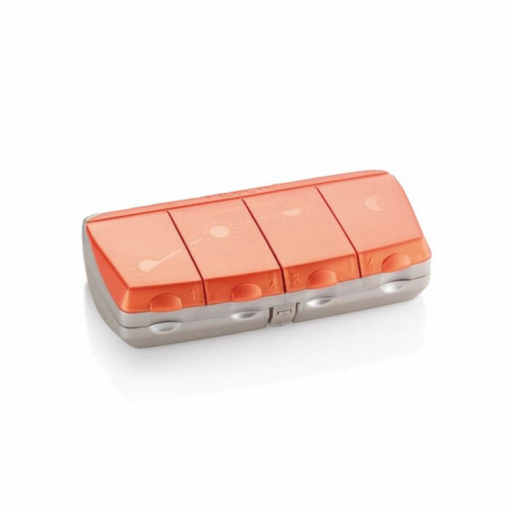 Porta Comprimidos PILBOX Daily compacto para a ingestão dia a dia e ideal para viagens e deslocamento curtos.Composição: Cores: Disponível em 2 cores: Laranja e Verde Escuro. Dimensões: 11 x 6 x 2,6 cm. Produzido na França.;Informação Adicional: Para até 4 ingestões por dia: Manhã, Meio-Dia, Tarde e Noite. 4 compartimentos independentes na parte superior para cápsulas e comprimidos; 1 compartimento maior na parte inferior que pode armazenar uma cartela de medicamentos, uma ampola, ou um tubo de remédios homeopáticos. Indicações em Alto Relevo: Para marcar cada ingestão símbolos e marcas numéricas.;