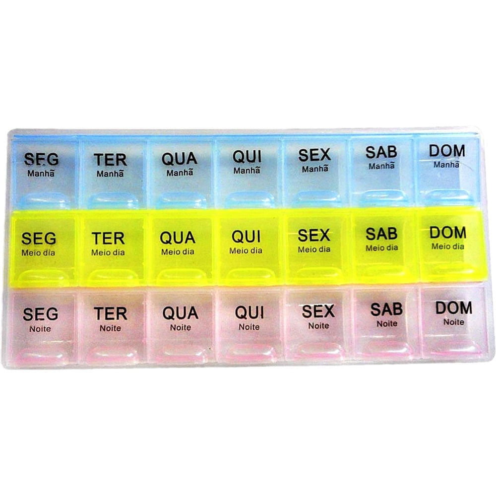 Porta Comprimidos para uso semanal dividido em 3 períodos diáriosManhãMeio DiaNoiteLetras grandes de fácil visualização, com cores diferentes em cada período3 Compartimentos diários, 7 dias por semana22cm De Comprimento9cm De Largura2cm De AlturaRepartição dos remédios tamanhos 3x3cmPeso 0,075grPeça plástica em polipropenoContém 01 unidade.As cores apresentadas no site são meramente ilustrativas e podem ou não corresponder com exatidão à tonalidade aplicada.Para mais informações sobre manuseio e cuidados quanto ao uso do produto, consulte o Manual do Usuário.Imagem meramente ilustrativa e a descrição do produto é de responsabilidade do fabricante.Modelo: Padrão;Tamanho: Padrão;Cor: Padrão;
