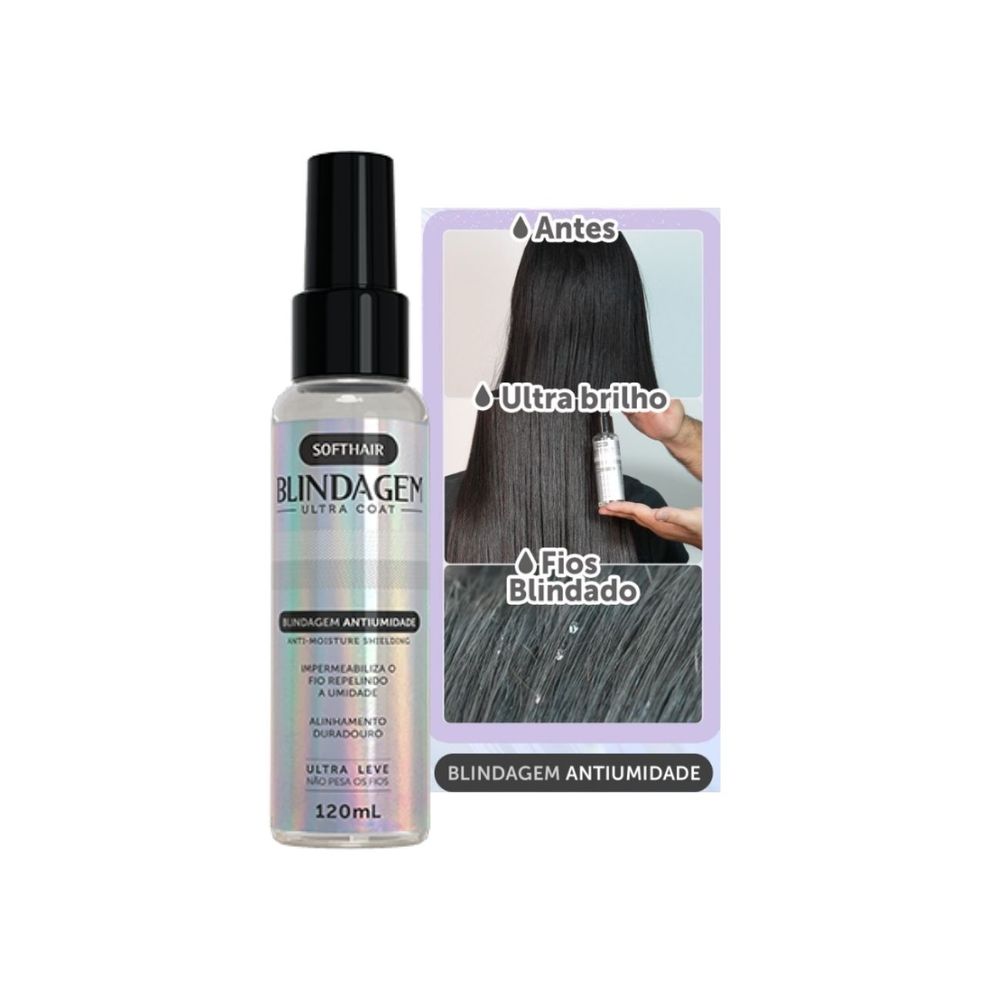 Spray Blindagem Ultra Coat para Cabelo Soft Hair: Proteção Total Contra a Umidade e Liso Absoluto!Quer manter seus cabelos impecáveis, sem frizz e protegidos da umidade por mais tempo? O Spray de Blindagem Anti Umidade Ultra Coat para Cabelo Soft Hair é a solução perfeita para quem busca fios disciplinados e um penteado duradouro, mesmo em dias de clima instável.O extraordinário Spray Defrizante Ultra Coat possui tecnologia de blindagem anti umidade que confere um liso absoluto, brilho intenso e repele umidade dos fios por até 10 lavagens. Com efeito “umbrella / hairglass” que protege os fios não só da umidade, mas também de agressões externas por mais tempo. Textura ultra leve para finalização sem pesar os fios ou deixa-los oleosos.Indicação de usoIndicado para todos os tipos de cabelo que buscam intenso alinhamento e proteção dos fios contra umidade.O que é o spray de blindagem anti umidade?O spray de blindagem anti umidade foi desenvolvido para criar uma camada protetora ao redor dos fios, blindando o cabelo contra os efeitos da umidade, que costumam causar frizz, volume excessivo e deixar os cabelos com aspecto desalinhado. Com sua fórmula avançada, ele preserva a hidratação natural do cabelo e prolonga a durabilidade do penteado.Benefícios do Spray Blindagem Anti Umidade Ultra Coat Soft Hair:– Reduz o tempo de secagem;– Ativado com calor (secador);– Ultraleve, não pesa os fios;– Mantém a raiz alinhada por mais tempo sem criar volume (raiz inchada);– Alinhamento da fibra capilar de forma gradativa (quanto mais utilizar, maior alinhamento)– Impermeabiliza o fio repelindo a umidade;ANVISA PROCESSO: 25351.366676/2024-90 AFE 201236-1Como usar o Spray Blindagem Anti Umidade Ultra Coat Soft Hair?Lave os cabelos com a linha Soft Hair de sua preferência, seque os fios com ajuda de uma toalha e separe-o em mechas. Borrife o produto mecha a mecha até completar todo o cabelo, escove com fonte de calor e use prancha se preferir.-------------------------Principais Tags de Pesquisa:anti umidade cabelo, leave in anti umidade, pre escova, spray mais liso, spray pré escova, spray pré escova mais liso, spray de blindagem anti umidade, spray anti umidade para cabelo, proteção contra umidade no cabelo, controle de frizz, blindagem capilar anti umidade, cabelo arma com umidade, cabelo com raiz alta, cabelo liso com raiz alta, cabelo com raiz alta o que fazer
