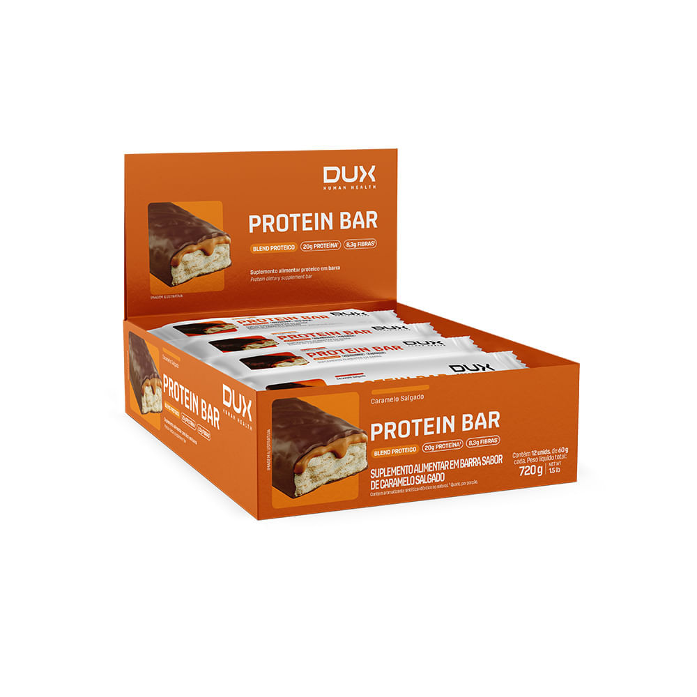 ;product-group: group-proteinbar;Descrição Inicial: {"descricao-inicial":{"title":"Barra de proteína saudável","description":"Nutritiva e incrivelmente saborosa, é ideal para o dia a dia. ","color":"#000000","id":1}};Resumo: {"resumo":[{"title":"O que é","description":"Nossa Protein bar contém 20 g de proteína por barra, auxilia no ganho de massa muscular, controla o apetite e promove saciedade. Possui frutas ou nuts naturais, oferecendo um valor nutritivo ainda maior e um sabor incrível. É uma ótima escolha para atingir metas nutricionais diárias enquanto desfruta de um snack saboroso e funcional.","id":1},{"title":"Ideal Para","description":"Ideal para quem busca uma solução prática e deliciosa para complementar a ingestão diária de proteínas. Um produto desenvolvido para atender às necessidades de quem tem um estilo de vida agitado e procura uma opção saudável e conveniente para lanches intermediários.","id":2},{"title":"Por trás do rótulo","description":"A proteína é um macronutriente essencial porque fornece aminoácidos fundamentais para a construção e reparação do tecido muscular. Nosso Protein Bar composto por proteínas de alto valor biológico e uma combinação equilibrada de carboidratos e gorduras saudáveis, fornece energia de forma sustentada e contribuem para um estilo de vida saudável e ativo.","id":3}]};Ícones: {"icones":[{"title":"20g Proteína","image":"https://duxnutrition.vtexassets.com/assets/vtex.file-manager-graphql/images/b5ddac0b-2d63-43af-888c-a3a50763a37c___3e228787e51a411976e204dbdef1e384.png","id":1},{"title":"Praticidade e Sabor","image":"https://duxnutrition.vtexassets.com/assets/vtex.file-manager-graphql/images/a7feb15a-4f53-4b64-b086-b5acbbbfd15c___d3110f7b4456f520791870eaced02dbd.png","id":2},{"title":"Sem Açúcares Adicionados","image":"https://duxnutrition.vtexassets.com/assets/vtex.file-manager-graphql/images/37962231-b658-424f-9d26-f578c0a7d20e___f035e5c1d4bae9e5cc5e0aebe909ee39.png","id":3},{"title":"Aromas e Corantes naturais","image":"https://duxnutrition.vtexassets.com/assets/vtex.file-manager-graphql/images/51b25dae-a1d1-4a9b-8dd3-e558bfd1c9a4___2c84838f75747db385a0f0edd3ecc815.png","id":4}]};Texto Longo: {"texto-longo":{"title":"Sugestões de Uso","text":"Da forma como preferir. A barrinha é perfeita para um impulso nutritivo de manhã, um lanche da tarde para aliviar a fome, antes do treino para mais energia e depois para recuperação muscular e até na ceia para garantir a saciedade antes de dormir.","id":1}};Inf Nutricional: {"tabela-nutricional":{"background":"https://duxnutrition.vtexassets.com/assets/vtex.file-manager-graphql/images/6de8788e-68a6-43d1-aa1b-2f985ef995c5___c101317ccdbc05f1dedf715eca96fffe.jpg","backgroundMobile":"https://duxnutrition.vtexassets.com/assets/vtex.file-manager-graphql/images/6de8788e-68a6-43d1-aa1b-2f985ef995c5___c101317ccdbc05f1dedf715eca96fffe.jpg","items":[{"flavorReplaced":"beijinho","flavor":"Beijinho","id":1,"text":"Quantidade por porção: 60 g\r\nPorção: 60g (1 unidade)","items":[{"id":1,"title":"","text":"60 g","value":"% VD*"},{"id":2,"title":"Valor energético (kcal)","text":"229","value":"0.11"},{"id":3,"title":"Carboidratos (g)","text":"15","value":"0.05"},{"id":4,"title":"Açúcares totais (g)","text":"1.8","value":""},{"id":5,"title":"Açúcares adicionados (g)","text":"0","value":"0"},{"id":6,"title":"Proteínas (g)","text":"20","value":"0.4"},{"id":7,"title":"Gorduras totais (g)","text":"9.9","value":"0.15"},{"id":8,"title":"Gorduras saturadas (g)","text":"6.5","value":"0.33"},{"id":9,"title":"Fibras alimentares (g)","text":"9.8","value":"0.39"},{"id":10,"title":"Sódio (mg)","text":"61","value":"0.03"},{"id":11,"title":"Cálcio (mg)","text":"199","value":"0.2"},{"id":12,"title":"Fósforo (mg)","text":"125","value":"0.18"}]},{"flavorReplaced":"chocolate e amendoim","flavor":"Chocolate e Amendoim","id":2,"text":"Quantidade por porção: 60 g\r\nPorção: 60g (1 unidade)","items":[{"id":1,"title":"","text":"60 g","value":"% VD*"},{"id":2,"title":"Valor energético (kcal)","text":"226","value":"0.11"},{"id":3,"title":"Carboidratos (g)","text":"14","value":"0.05"},{"id":4,"title":"Açúcares totais (g)","text":"1.3","value":""},{"id":5,"title":"Açúcares adicionados (g)","text":"0","value":"0"},{"id":6,"title":"Proteínas (g)","text":"20","value":"0.4"},{"id":7,"title":"Gorduras totais (g)","text":"10","value":"0.15"},{"id":8,"title":"Gorduras saturadas (g)","text":"5.8","value":"0.29"},{"id":9,"title":"Fibras alimentares (g)","text":"9.7","value":"0.39"},{"id":10,"title":"Sódio (mg)","text":"59","value":"0.03"},{"id":11,"title":"Cálcio (mg)","text":"190","value":"0.19"},{"id":12,"title":"Fósforo (mg)","text":"119","value":"0.17"}]},{"flavorReplaced":"chocolate e avelã","flavor":"Chocolate e Avelã","id":3,"text":"Quantidade por porção: 60 g\r\nPorção: 60g (1 unidade)","items":[{"id":1,"title":"","text":"60 g","value":"% VD*"},{"id":2,"title":"Valor energético (kcal)","text":"225","value":"0.11"},{"id":3,"title":"Carboidratos (g)","text":"14","value":"0.05"},{"id":4,"title":"Açúcares totais (g)","text":"1.1","value":""},{"id":5,"title":"Açúcares adicionados (g)","text":"0.1","value":"0"},{"id":6,"title":"Proteínas (g)","text":"20","value":"0.4"},{"id":7,"title":"Gorduras totais (g)","text":"9.9","value":"0.15"},{"id":8,"title":"Gorduras saturadas (g)","text":"6.3","value":"0.32"},{"id":9,"title":"Fibras alimentares (g)","text":"10","value":"0.4"},{"id":10,"title":"Sódio (mg)","text":"48","value":"0.02"},{"id":11,"title":"Cálcio (mg)","text":"194","value":"0.19"},{"id":12,"title":"Fósforo (mg)","text":"122","value":"0.17"}]},{"flavorReplaced":"chocolate e coco","flavor":"Chocolate e Coco","id":4,"text":"Quantidade por porção: 60 g\r\nPorção: 60g (1 unidade)","items":[{"id":1,"title":"","text":"60 g","value":"% VD*"},{"id":2,"title":"Valor energético (kcal)","text":"226","value":"0.11"},{"id":3,"title":"Carboidratos (g)","text":"14","valu