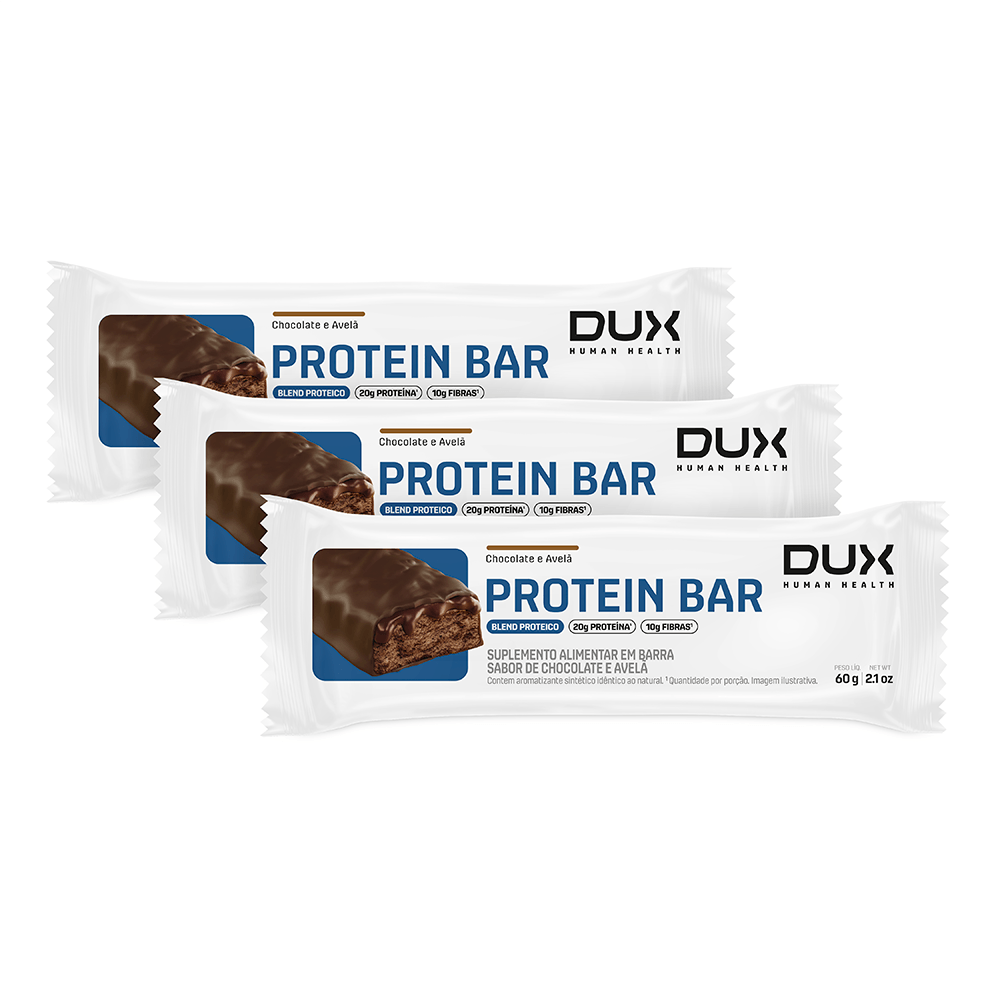 ;product-group: group-proteinbar;Descrição Inicial: {"descricao-inicial":{"title":"Barra de proteína saudável","description":"Nutritiva e incrivelmente saborosa, é ideal para o dia a dia. ","color":"#fff","id":1}};Resumo: {"resumo":[{"title":"O que é","description":"Nossa Protein bar contém 20 g de proteína por barra, auxilia no ganho de massa muscular, controla o apetite e promove saciedade. Possui frutas ou nuts naturais, oferecendo um valor nutritivo ainda maior e um sabor incrível. É uma ótima escolha para atingir metas nutricionais diárias enquanto desfruta de um snack saboroso e funcional.","id":1},{"title":"Ideal Para","description":"Ideal para quem busca uma solução prática e deliciosa para complementar a ingestão diária de proteínas. Um produto desenvolvido para atender às necessidades de quem tem um estilo de vida agitado e procura uma opção saudável e conveniente para lanches intermediários.","id":2},{"title":"Por trás do rótulo","description":"A proteína é um macronutriente essencial porque fornece aminoácidos fundamentais para a construção e reparação do tecido muscular. Nosso Protein Bar composto por proteínas de alto valor biológico e uma combinação equilibrada de carboidratos e gorduras saudáveis, fornece energia de forma sustentada e contribuem para um estilo de vida saudável e ativo.","id":3}]};Ícones: {"icones":[{"title":"20g Proteína","image":"https://duxnutrition.vtexassets.com/assets/vtex.file-manager-graphql/images/b5ddac0b-2d63-43af-888c-a3a50763a37c___3e228787e51a411976e204dbdef1e384.png","id":1},{"title":"Praticidade e Sabor","image":"https://duxnutrition.vtexassets.com/assets/vtex.file-manager-graphql/images/a7feb15a-4f53-4b64-b086-b5acbbbfd15c___d3110f7b4456f520791870eaced02dbd.png","id":2},{"title":"Sem Açúcares Adicionados","image":"https://duxnutrition.vtexassets.com/assets/vtex.file-manager-graphql/images/37962231-b658-424f-9d26-f578c0a7d20e___f035e5c1d4bae9e5cc5e0aebe909ee39.png","id":3},{"title":"Aromas e Corantes naturais","image":"https://duxnutrition.vtexassets.com/assets/vtex.file-manager-graphql/images/51b25dae-a1d1-4a9b-8dd3-e558bfd1c9a4___2c84838f75747db385a0f0edd3ecc815.png","id":4}]};Texto Longo: {"texto-longo":{"title":"Sugestões de Uso","text":"Da forma como preferir. A barrinha é perfeita para um impulso nutritivo de manhã, um lanche da tarde para aliviar a fome, antes do treino para mais energia e depois para recuperação muscular e até na ceia para garantir a saciedade antes de dormir.","id":1}};Inf Nutricional: {"tabela-nutricional":{"background":"https://duxnutrition.vtexassets.com/assets/vtex.file-manager-graphql/images/6de8788e-68a6-43d1-aa1b-2f985ef995c5___c101317ccdbc05f1dedf715eca96fffe.jpg","backgroundMobile":"https://duxnutrition.vtexassets.com/assets/vtex.file-manager-graphql/images/6de8788e-68a6-43d1-aa1b-2f985ef995c5___c101317ccdbc05f1dedf715eca96fffe.jpg","items":[{"flavorReplaced":"beijinho","flavor":"Beijinho","id":1,"text":"Quantidade por porção: 60 g\r\nPorção: 60g (1 unidade)","items":[{"id":1,"title":"","text":"60 g","value":"% VD*"},{"id":2,"title":"Valor energético (kcal)","text":"229","value":"0.11"},{"id":3,"title":"Carboidratos (g)","text":"15","value":"0.05"},{"id":4,"title":"Açúcares totais (g)","text":"1.8","value":""},{"id":5,"title":"Açúcares adicionados (g)","text":"0","value":"0"},{"id":6,"title":"Proteínas (g)","text":"20","value":"0.4"},{"id":7,"title":"Gorduras totais (g)","text":"9.9","value":"0.15"},{"id":8,"title":"Gorduras saturadas (g)","text":"6.5","value":"0.33"},{"id":9,"title":"Fibras alimentares (g)","text":"9.8","value":"0.39"},{"id":10,"title":"Sódio (mg)","text":"61","value":"0.03"},{"id":11,"title":"Cálcio (mg)","text":"199","value":"0.2"},{"id":12,"title":"Fósforo (mg)","text":"125","value":"0.18"}]},{"flavorReplaced":"chocolate e amendoim","flavor":"Chocolate e Amendoim","id":2,"text":"Quantidade por porção: 60 g\r\nPorção: 60g (1 unidade)","items":[{"id":1,"title":"","text":"60 g","value":"% VD*"},{"id":2,"title":"Valor energético (kcal)","text":"226","value":"0.11"},{"id":3,"title":"Carboidratos (g)","text":"14","value":"0.05"},{"id":4,"title":"Açúcares totais (g)","text":"1.3","value":""},{"id":5,"title":"Açúcares adicionados (g)","text":"0","value":"0"},{"id":6,"title":"Proteínas (g)","text":"20","value":"0.4"},{"id":7,"title":"Gorduras totais (g)","text":"10","value":"0.15"},{"id":8,"title":"Gorduras saturadas (g)","text":"5.8","value":"0.29"},{"id":9,"title":"Fibras alimentares (g)","text":"9.7","value":"0.39"},{"id":10,"title":"Sódio (mg)","text":"59","value":"0.03"},{"id":11,"title":"Cálcio (mg)","text":"190","value":"0.19"},{"id":12,"title":"Fósforo (mg)","text":"119","value":"0.17"}]},{"flavorReplaced":"chocolate e avelã","flavor":"Chocolate e Avelã","id":3,"text":"Quantidade por porção: 60 g\r\nPorção: 60g (1 unidade)","items":[{"id":1,"title":"","text":"60 g","value":"% VD*"},{"id":2,"title":"Valor energético (kcal)","text":"225","value":"0.11"},{"id":3,"title":"Carboidratos (g)","text":"14","value":"0.05"},{"id":4,"title":"Açúcares totais (g)","text":"1.1","value":""},{"id":5,"title":"Açúcares adicionados (g)","text":"0.1","value":"0"},{"id":6,"title":"Proteínas (g)","text":"20","value":"0.4"},{"id":7,"title":"Gorduras totais (g)","text":"9.9","value":"0.15"},{"id":8,"title":"Gorduras saturadas (g)","text":"6.3","value":"0.32"},{"id":9,"title":"Fibras alimentares (g)","text":"10","value":"0.4"},{"id":10,"title":"Sódio (mg)","text":"48","value":"0.02"},{"id":11,"title":"Cálcio (mg)","text":"194","value":"0.19"},{"id":12,"title":"Fósforo (mg)","text":"122","value":"0.17"}]},{"flavorReplaced":"chocolate e coco","flavor":"Chocolate e Coco","id":4,"text":"Quantidade por porção: 60 g\r\nPorção: 60g (1 unidade)","items":[{"id":1,"title":"","text":"60 g","value":"% VD*"},{"id":2,"title":"Valor energético (kcal)","text":"226","value":"0.11"},{"id":3,"title":"Carboidratos (g)","text":"14","value":