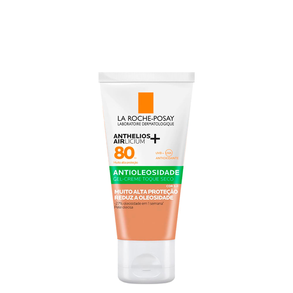 Protetor Solar Facial Antioleosidade com Controle de Brilho, Cor 2.0, FPS 80, Anthelios Airlicium+ La Roche-Posay 40gO protetor solar Anthelios Airlicium+ FPS80 foi criado para quem luta contra a oleosidade excessiva. Sua tecnologia exclusiva Airlicium+ não apenas controla o brilho durante o uso, mas atua na redução contínua da oleosidade, com resultados visíveis em uma semana. Com altíssima proteção solar (FPS80 e PPD33), ele também defende a pele contra a pigmentação causada pela luz visível. A textura gel creme de rápida absorção garante um toque seco e efeito matte por 12 horas, proporcionando uma sensação de pele limpa e fresca, com cobertura uniforme que não escorre nem craquela.Benefícios do Protetor Solar Reduz a oleosidade da pele em -27% na primeira semana e -56% após quatro semanas de uso contínuo.Oferece altíssima proteção solar com FPS 80 e PPD 33, prevenindo os danos causados pelos raios UVA/UVB.Controla todas as fontes de brilho, como oleosidade e umidade, por até 12 horas com sensação de pele limpa.Proporciona cobertura de maquiagem uniforme e duradoura com uma textura gel creme que não pesa nem craquela.Protege contra a pigmentação induzida pela luz visível, ajudando a manter o tom da pele mais uniforme.Ação/Resultado dos AtivosTecnologia Airlicium+ – Atua de forma inteligente no controle da oleosidade, absorvendo o sebo e o suor, e mantendo a pele com efeito matte por até 12 horas. Filtros Solares Avançados FPS 80 e PPD 33 – Garantem altíssima proteção contra os raios UVA, UVB e a luz visível, prevenindo manchas, envelhecimento precoce e pigmentação. Sílica Antibrilho – Controla o brilho e proporciona acabamento seco e uniforme, ideal para peles com tendência à oleosidade. Glicerina – Oferece hidratação leve e equilíbrio da barreira cutânea, sem deixar a pele pegajosa. A combinação desses ativos promove controle duradouro da oleosidade, proteção solar de amplo espectro e efeito matte instantâneo, deixando a pele limpa, fresca e com tom uniforme ao longo do dia.Como Usar o Protetor Solar Facial Antioleosidade La Roche-PosayAplique uma camada generosa sobre a pele limpa e seca, 30 minutos antes de se expor ao sol.Para manter a proteção, reaplique o produto sempre que houver sudorese intensa, após nadar, secar-se com a toalha ou durante longos períodos de exposição solar.Transforme sua rotina de cuidados e garanta uma pele protegida, matificada e uniforme o dia todo.