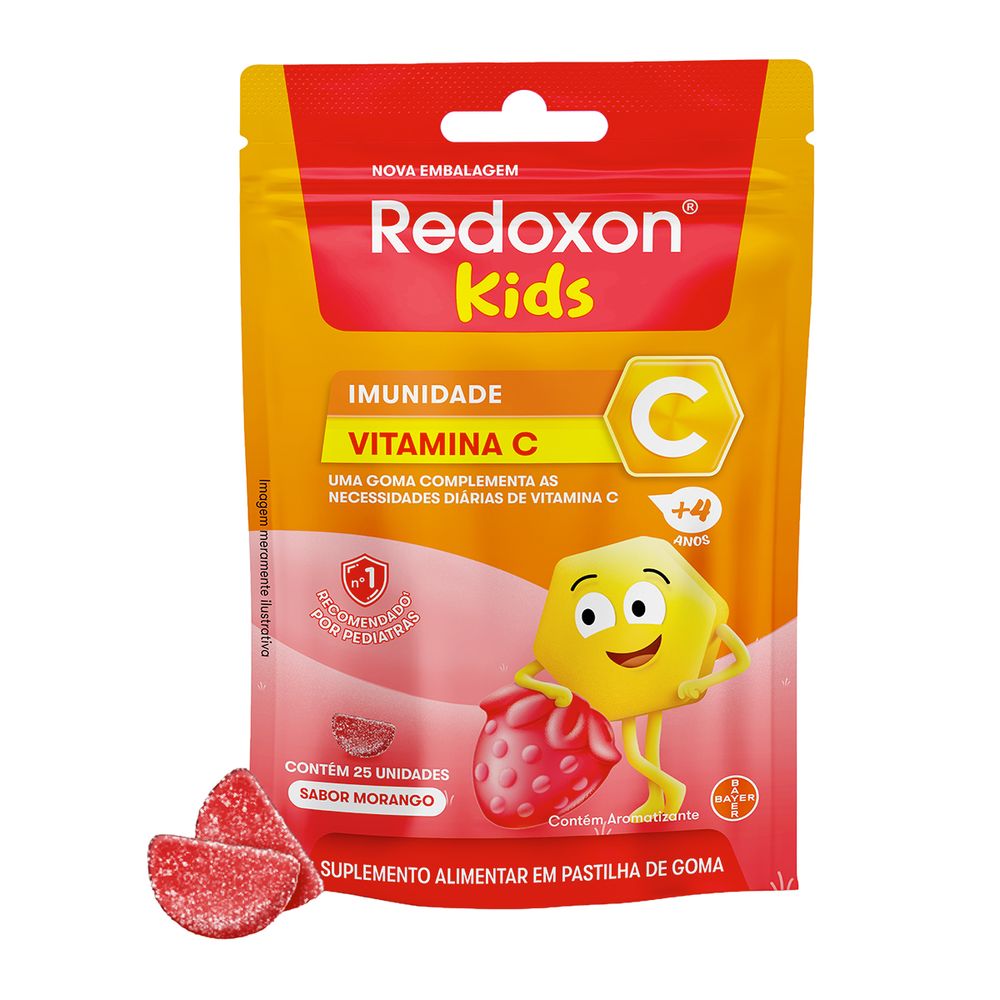 Redoxon Kids Vitamina C apresenta 25 gomas mastigáveis com sabor de morango, formuladas especificamente para complementar a nutrição infantil e auxiliar no fortalecimento do sistema imunológico das crianças.