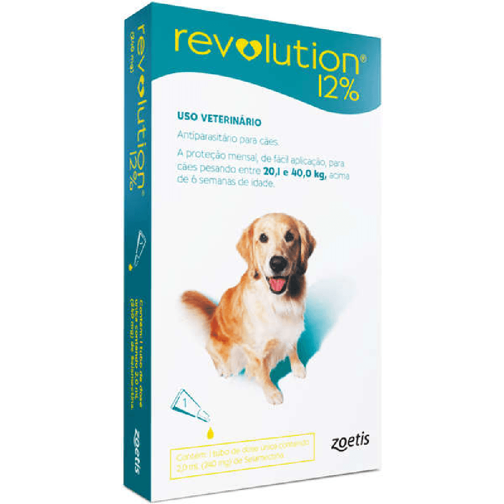 Antiparasitário de uso tópico indicado para cães (Revolution 6% e 12%) e gatos (Revolution 6%). À base de Selamectina, Revolution trata, previne e controla infestações por pulgas, controla a dermatite alérgica por picada de pulgas (DAPP), previne a dirofilariose, trata e controla sarna de ouvidos, sarna sarcóptica em cães, vermes intestinais, infestações por piolhos e é auxiliar no controle de carrapatos em cães. Pode ser usado em cadelas prenhes e em filhotes a partir de 6 semanas de idade.Tamanho do Pet: Todos os tamanhos;Composição: Composição cada 1 ml: Selamectina.............................. 120,0mg Excipiente q.s.q.......................... 1,0ml;Aplicação: Aplicação: Revolution® é de fácil aplicação, não é oleoso e tem secagem rápida, assim você mantêm seu cão e gato sempre bonitos e pode ter contato com eles imediatamente após a secagem. A tampa da pipeta e a embalagem têm cores diferentes dependendo do peso do animal, garantindo muito mais segurança no momento da aplicação do produto no seu amiguinho. Além disso, é fácil de abrir e seu formato evita o contato direto com o produto, que pode ser aplicado em um único ponto do animal e possui baixo volume (ml por kg).;Dosagem: Dosagem: Recomendamos utilizar a dosagem prescrita pelo médico veterinário. O conteúdo de cada tubo é formulado para permitir um mínimo de 6 mg de Selamectina por kg de peso corporal. O produto deve ser aplicado de acordo com o peso do animal, conforme informação: Cães entre 20,1kg a 40kg – 2 mL;Sobre o Fabricante: Zoetis é uma companhia líder em saúde animal, focada em apoiar os clientes e seus respectivos negócios. Com o legado de mais de 60 anos de história, a Zoetis descobre, desenvolve, produz e comercializa vacinas e medicamentos veterinários para animais de criação e de companhia. A Zoetis está presente em aproximadamente 70 países; incluindo 27 fábricas em 10 países. Seus produtos atendem médicos veterinários, pecuaristas, proprietários de animais de produção e de animais de companhia, em 120 países. Nosso nome, Zoetis™ (zo-EH-tis), tem sua raiz em zo, familiar em palavras como zoológico e zoologia, derivado de Zoético, que significa “relativo à vida animal.” O nome indica a dedicação da nossa empresa em ajudar veterinários e pecuaristas que criam e se preocupam com suas criações ou animais de estimação dos quais todos nós dependemos. A linha da Zoetis para Animais de Companhia conta com um portfólio de mais de 25 medicamentos e produtos que permeiam as mais diversas áreas, buscando sempre o bem-estar do seu animal.;Outras Informações: Indicação: Medicamento trata, previne e controla infestações por pulgas, controla a dermatite alérgica por picada de pulgas (DAPP), previne a dirofilariose, trata e controla sarna de ouvidos, sarna sarcóptica em cães, vermes intestinais, infestações por piolhos e é auxiliar no controle de carrapatos em cães. Em cães, Revolution® 12% é indicado para: • Tratamento, prevenção e controle de infestações por pulgas (Ctenocephalides sp.), Controle da dermatite alérgica por picada de pulgas (DAPP). • Prevenção da dirofilariose (Dirofilaria immitis). • Tratamento e controle da sarna de ouvidos (Otodectes cynotis). • Tratamento e controle da sarna sarcóptica (Sarcoptes scabiei). • Tratamento e controle de vermes intestinais (Toxocara canis). • Proteção da ninhada contra pulgas (Ctenocephalides sp.). • Auxiliar no controle de carrapatos (Rhipicephalus sanguineus e Dermacentor variabilis). • Tratamento e controle de infestação por piolhos (Trichodectes canis). Apresentação: Revolution® está disponível em pipetas de uso tópico, em embalagens contendo uma ou três pipetas 12% para cães entre 20,1kg a 40kg (tubo com 240 mg), volume administrado 2ml.;Melhor Opção: nenhum;Descrição Tópicos: - Indicado para cães; - Controla e previne a infestação de pulgas e carrapatos; - Auxilia no controle da dermatite alérgica por picadas de pulgas (DAPP); - Previne a dirofilariose e vermes intestinais; - Tem fácil aplicação.;Assista ao vídeo do produto: ;