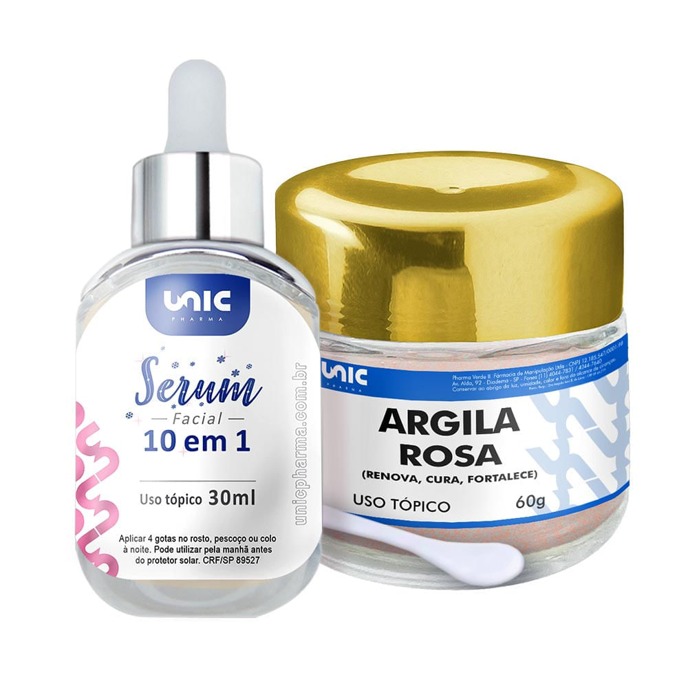 Sérum Facial 10 em 30ml + Máscara de Argila Rosa 60g Tudo o que você precisa para sua seu cuidado FacialReduz linhas e marcas de expressões, praticidade e beleza.Ácido HialurônicoPromove a hidratação da pele, ajuda a manter a sustentação , evita flacidez, linhas e sinais de expressão, preenchendo e mantendo a pele viçosa e revitalizada. Com aplicação contínua, pode estimular a pele a produzir mais ácido hialurônico para uma hidratação mais profunda.Vitamina ETem benefícios hidratantes e ajuda a fortalecer a barreira cutânea. Seu poder anti-inflamatório natural, também contribui no efeito calmante em peles sensíveis.RetinolAtua na renovação celular, diminui manchas, estimula a produção de colágeno, além de agir na uniformização de textura e tom da pele, traz luminosidade, aumentar a firmeza da pele e reduz poros.Colágeno hidrolisadoAtua na pele como fonte de aminoácidos, assim como colabora com o aumento da quantidade de água, promovendo a hidratação da epiderme e auxiliando no disfarce das rugas finas e linhas de expressão.ResveratrolUsado diariamente, prevenindo o envelhecimento cutâneo. Estimula a síntese de colágeno e melhorar a elasticidade, dá força e brilho à pele.Vitamina CPossui uma ação antioxidante forte e eficaz, que ajuda na produção de colágeno e colabora na diminuição dos radicais livres, além de ter ação inibidora na formação de melanina, o que beneficia a luminosidade da pele, deixando-a mais viçosa, bonita e com aparência saudável.Rosa MosquetaÉ capaz de reforçar a síntese de colágeno e elastina, o que fortalece e dá firmeza à pele, sendo também responsável por nutri-la profundamente.O óleo de rosa de mosqueta é uma ótima opção para hidratar e suavizar a pele. Possui propriedades adstringentes, antioxidantes, emolientes e hidratantes.Algas MarinhasAção emoliente, remineralizante, suavizante e hidratante.AlontaínaAtua como um emoliente, ou seja, forma uma camada protetora sobre a pele. Ela previne que a sua pele perca água, mantendo a umidade no interior das células córneas e assegura o nível adequado de umidade no estrato córneo. Com isso, a pele fica mais macia e radiantePantenolÉ um regenerador cutâneo, desenvolve um efeito eutrófico dérmico e cicatrizante aumentando a resistência das fibras colágenas. Possui ação cicatrizante umectante e hidratante.BenefíciosConta com 10 princípios ativos que suavizam, umidificam, hidratam, acalmam, como também promovem a produção de colágeno, a regeneração celular, diminui a aparência de cicatrizes, rugas e manchas.PosologiaApós a limpeza do rosto, aplicar de 2 a 4 gotas do sérum 10 em 1 e espalhar por todo o rosto, pescoço e colo. Pode ser utilizado de manhã e à noite. Durante o uso do produto, é recomendado pela manhã a utilização de algum produto com fator de proteção solar. Pode ser aplicado antes da maquiagem, primer ou protetor solar.Composição até 35 anosÁcido Hialurônico 1%Vitamina E 1%Retinol 0,5%Colágeno Hidrolisado 2,5%Resveratrol 2%Vitamina C 5%Rosa Mosqueta 1%Algas Marinhas 3%Pantenol 0,5%Alontoína 1%Composição + 35 anosÁcido Hialurônico 5%Vitamina E 3%Retinol 1%Colágeno Hidrolisado 5%Resveratrol 3%Vitamina C 5%Rosa Mosqueta 3%Algas Marinhas 4%Pantenol 1%Alontoína 1,5%Composição + 45 anosÁcido Hialurônico 7%Vitamina E 5%Retinol 2%Colágeno Hidrolisado 7%Resveratrol 3%Vitamina C 7%Rosa Mosqueta 4%Algas Marinha 5%Pantenol 1,5%Alontoína 2%Composição + 60 anosÁcido Hialurônico 10%Vitamina E 5%Retinol 2%Colágeno Lipolizado 10%Resveratrol 3%Talasferes Vitamina C 8%Rosa Mosqueta 5%Densiskin 2%Mateixyl 2%Alontoína 2%Máscara Argila Rosa - Pele Renovada (Hidratante e Calmante)A argila rosa é indicada para peles sensíveis, delicadas, avermelhadas, com tendência alérgicas ou irritadas, desidratadas, acneicas e com vasinhos e rosáceas. Ela é rica em óxido de ferro, que tem papel importante na respiração celular e na transferência de elétrons, mantendo a pele hidratada e com elasticidade.Calmante e perfeita nos momentos de relaxamento Além da Argila Rosa que é rica em minerais que auxiliam a remover as impurezas acumuladas da pele, a máscara conta com o extrato de acido ferrulico , ingrediente conhecido por ter propriedades antioxidantes que ajudam a proteger contra a ação dos radicais livres, revelando uma pele limpa, tratada e com brilho natural.BenefíciosAcalma e hidrata a pele;Limpeza essencial sem ressecar;Pele fresca e renovada;Sensação de suavidade;Para todos os tipos de pele.Para que serve o Sérum Facial 10 em 1? Conta com 10 princípios ativos que suavizam, umidificam, hidratam, acalmam, como também promovem a produção de colágeno, a regeneração celular, diminui a aparência de cicatrizes, rugas e manchas. Como usar o Sérum Facial 10 em 1? Após a limpeza do rosto, aplicar de 2 a 4 gotas do sérum 10 em 1 e espalhar por todo o rosto, pescoço e colo. Pode ser utilizado de manhã e à noite. Durante o uso do produto, é recomendado pela manhã a utilização de algum produto com fator de proteção solar. Pode ser aplicado antes da maquiagem, primer ou protetor solar.Posso utilizar o Sérum Facial 10 em 1 antes da maquiagem? Sim. O Sérum 10 em 1 pode ser usado antes da maquiagem pois mantém a pele sem oleosidade por mais tempo.O Sérum Facial 10 em 1 pode ser usado em todos os tipos de pele?Sim, pode ser usado em todas as peles, só não deve ser utilizado em peles lesionadas ou irritadas.O Sérum Facial 10 em 1 trata manchas?Sim! Auxilia no clareamento da pele, devido aos ativos.O Sérum ajuda na flacidez de peles maduras?Sim. Há um ganho na sustentação na pele, com um grande poder de estímulo de colágeno.Onde comprar o Sérum Facial 10 em 1? Só na Unicpharma, você encontra Sérum Facial 10 em 1, com os melhores preços e as melhores condições.*Não se trata de propaganda, e sim de descrição do produto, consulte sempre um especialista. **Venda Sob prescri