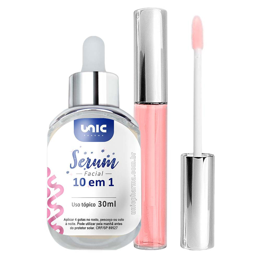 Sérum facial 10 em 1 mais Preenchimento labialTudo o que você precisa para sua pele em um único sérum.Reduz linhas e marcas de expressões, praticidade e beleza. Uso indicado para 2 vezes ao dia, manhã e noite.Ácido HialurônicoPromove a hidratação da pele, ajuda a manter a sustentação , evita flacidez, linhas e sinais de expressão, preenchendo e mantendo a pele viçosa e revitalizada. Com aplicação contínua, pode estimular a pele a produzir mais ácido hialurônico para uma hidratação mais profunda.Vitamina ETem benefícios hidratantes e ajuda a fortalecer a barreira cutânea. Seu poder anti-inflamatório natural, também contribui no efeito calmante em peles sensíveis.RetinolAtua na renovação celular, diminui manchas, estimula a produção de colágeno, além de agir na uniformização de textura e tom da pele, traz luminosidade, aumentar a firmeza da pele e reduz poros.Colágeno hidrolisadoAtua na pele como fonte de aminoácidos, assim como colabora com o aumento da quantidade de água, promovendo a hidratação da epiderme e auxiliando no disfarce das rugas finas e linhas de expressão.ResveratrolUsado diariamente, prevenindo o envelhecimento cutâneo. Estimula a síntese de colágeno e melhorar a elasticidade, dá força e brilho à pele.Vitamina CPossui uma ação antioxidante forte e eficaz, que ajuda na produção de colágeno e colabora na diminuição dos radicais livres, além de ter ação inibidora na formação de melanina, o que beneficia a luminosidade da pele, deixando-a mais viçosa, bonita e com aparência saudável.Rosa MosquetaÉ capaz de reforçar a síntese de colágeno e elastina, o que fortalece e dá firmeza à pele, sendo também responsável por nutri-la profundamente.O óleo de rosa de mosqueta é uma ótima opção para hidratar e suavizar a pele. Possui propriedades adstringentes, antioxidantes, emolientes e hidratantes. Algas MarinhasAção emoliente, remineralizante, suavizante e hidratante.AlontaínaAtua como um emoliente, ou seja, forma uma camada protetora sobre a pele. Ela previne que a sua pele perca água, mantendo a umidade no interior das células córneas e assegura o nível adequado de umidade no estrato córneo. Com isso, a pele fica mais macia e radiantePantenolÉ um regenerador cutâneo, desenvolve um efeito eutrófico dérmico e cicatrizante aumentando a resistência das fibras colágenas. Possui ação cicatrizante umectante e hidratante.BenefíciosConta com 10 princípios ativos que suavizam, umidificam, hidratam, acalmam, como também promovem a produção de colágeno, a regeneração celular, diminui a aparência de cicatrizes, rugas e manchas.PosologiaApós a limpeza do rosto, aplicar de 2 a 4 gotas do sérum 10 em 1 e espalhar por todo o rosto, pescoço e colo. Pode ser utilizado de manhã e à noite. Durante o uso do produto, é recomendado pela manhã a utilização de algum produto com fator de proteção solar. Pode ser aplicado antes da maquiagem, primer ou protetor solar.Composição até 35 anos Ácido Hialurônico 1%Vitamina E 1%Retinol 0,5%Colágeno Hidrolisado 2,5%Resveratrol 2%Vitamina C 5%Rosa Mosqueta 1%Algas Marinhas 3%Pantenol 0,5%Alontoína 1%Composição + 35 anos Ácido Hialurônico 5%Vitamina E 3%Retinol 1%Colágeno Hidrolisado 5%Resveratrol 3%Vitamina C 5%Rosa Mosqueta 3%Algas Marinhas 4%Pantenol 1%Alontoína 1,5%Composição + 45 anosÁcido Hialurônico 7%Vitamina E 5%Retinol 2%Colágeno Hidrolisado 7%Resveratrol 3%Vitamina C 7%Rosa Mosqueta 4%Algas Marinha 5%Pantenol 1,5%Alontoína 2%Composição + 60 anosÁcido Hialurônico 10%Vitamina E 5%Retinol 2%Colágeno Lipolizado 10%Resveratrol 3%Talasferes Vitamina C 8%Rosa Mosqueta 5%Densiskin 2%Mateixyl 2%Alontoína 2%Preenchimento labial em Gloss-PremiumNova Fórmula com embalagem Premium: Lábios volumosos Sim!Preenchimento labial sem agulha? Sim! O Gloss da Unicpharma foi desenvolvido para proporcionar lábios volumosos além de deixar eles mais firmes e definidos. Conta com componentes especiais que ativam a circulação sanguínea na região labial que, com o uso contínuo, aumentam o volume dos lábios.ContémAdifyline:adifyline™ é um ativo capaz de aperfeiçoar e gerar a tão desejada aparência do rosto, busto, mãos, lábios e nádegas. adifyline™ age diretamente sobre os receptores pgc-1a, um coativador que está diretamente envolvido na adipogênese e age modulando a expressão gênica, regulando a taxa de maturação dos adipócitos e, ao interagir, torna-se um proliferador de peroxissomas causando aumento no volume de lípideos acumulados nas áreas desejadas. adifyline™ promove aumento do processo de adipogênese e conduz a um volume extra nas áreas desejadas: face, mãos, lábios busto ou nádegas.Ácido Hialurônico: adifyline™ age diretamente sobre os receptores pgc-1a, um coativador que está diretamente envolvido na adipogênese e age modulando a expressão gênica, regulando a taxa de maturação dos adipócitos e, ao interagir, torna-se um proliferador de peroxissomas causando aumento no volume de lípideos acumulados nas áreas desejadas. adifyline™ promove aumento do processo de adipogênese e conduz a um volume extra nas áreas desejadas: face, mãos, lábios busto ou nádegas.Manteiga de Karite:A manteiga de karité é capaz de prevenir e melhorar problemas da pele, como a dermatite atópica, estrias e até o envelhecimento precoce, regenerando e fortalecendo sua hidratação e maciez. Esse composto também pode ser usado na área das unhas e dos lábios para tratar o ressecamento.Lipossomas:Facilitam a permeação de ativos, tanto hidrofílicos quanto lipofílicos, aumentando sua estabilidade até o local de ação, facilitando a interação com as membranas das células da epidermeÓleo de FramboesaO Óleo de Framboesa possui níveis elevados de fitoesteróis que podem ajudar a reduzir a perda de água. Além disso, ele deixa uma camada fina que, além de proteger contra radiações ultravioletas, protege a