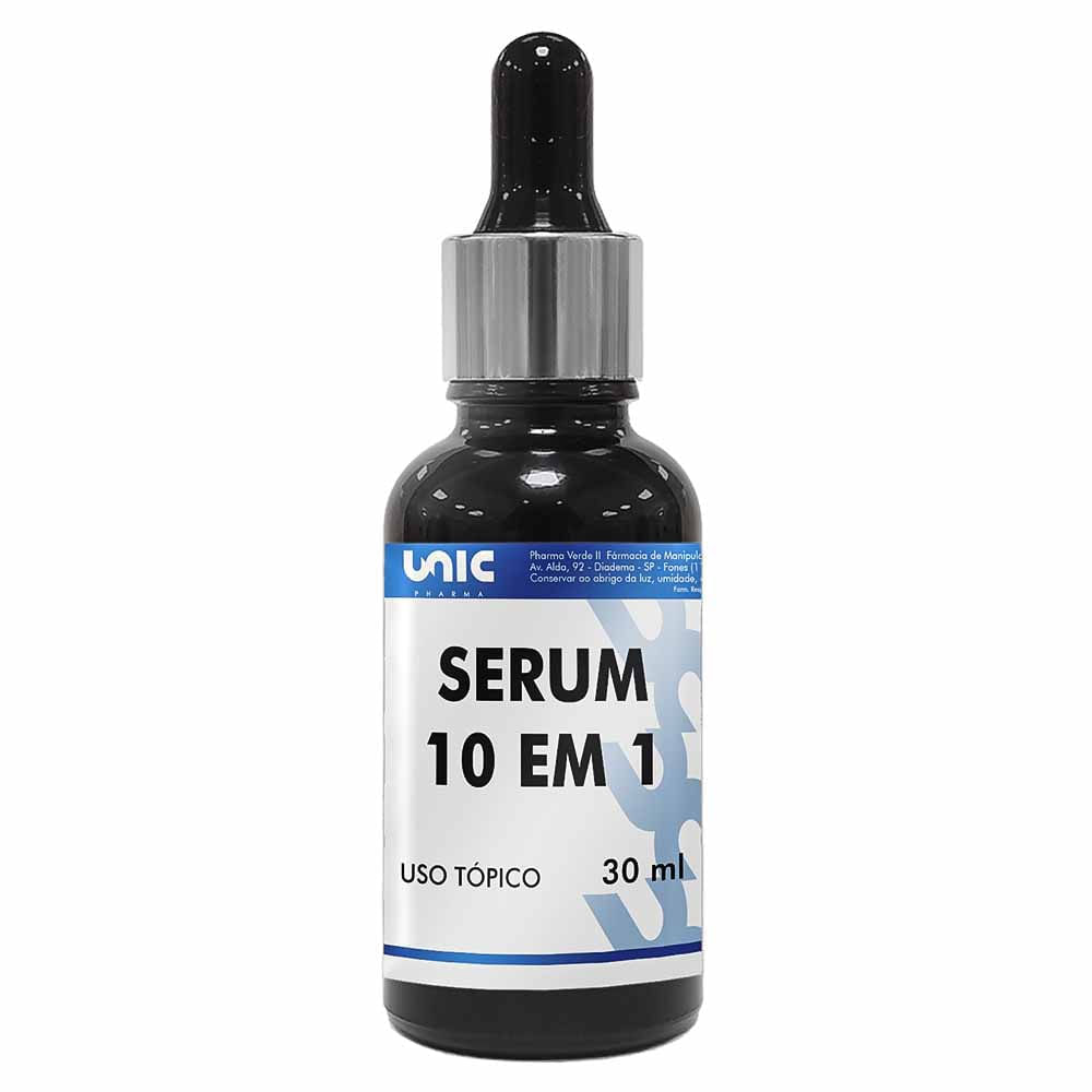 Sérum facial 10 em 1Tudo o que você precisa para sua pele em um único sérum.Reduz linhas e marcas de expressões, praticidade e beleza. Uso indicado para 2 vezes ao dia, manhã e noite.Ácido HialurônicoPromove a hidratação da pele, ajuda a manter a sustentação , evita flacidez, linhas e sinais de expressão, preenchendo e mantendo a pele viçosa e revitalizada. Com aplicação contínua, pode estimular a pele a produzir mais ácido hialurônico para uma hidratação mais profunda.Vitamina ETem benefícios hidratantes e ajuda a fortalecer a barreira cutânea. Seu poder anti-inflamatório natural, também contribui no efeito calmante em peles sensíveis.RetinolAtua na renovação celular, diminui manchas, estimula a produção de colágeno, além de agir na uniformização de textura e tom da pele, traz luminosidade, aumentar a firmeza da pele e reduz poros.Colágeno hidrolisadoAtua na pele como fonte de aminoácidos, assim como colabora com o aumento da quantidade de água, promovendo a hidratação da epiderme e auxiliando no disfarce das rugas finas e linhas de expressão.ResveratrolUsado diariamente, prevenindo o envelhecimento cutâneo. Estimula a síntese de colágeno e melhorar a elasticidade, dá força e brilho à pele.Vitamina CPossui uma ação antioxidante forte e eficaz, que ajuda na produção de colágeno e colabora na diminuição dos radicais livres, além de ter ação inibidora na formação de melanina, o que beneficia a luminosidade da pele, deixando-a mais viçosa, bonita e com aparência saudável.Rosa MosquetaÉ capaz de reforçar a síntese de colágeno e elastina, o que fortalece e dá firmeza à pele, sendo também responsável por nutri-la profundamente.O óleo de rosa de mosqueta é uma ótima opção para hidratar e suavizar a pele. Possui propriedades adstringentes, antioxidantes, emolientes e hidratantes.Algas MarinhasAção emoliente, remineralizante, suavizante e hidratanteAlontaínaAtua como um emoliente, ou seja, forma uma camada protetora sobre a pele. Ela previne que a sua pele perca água, mantendo a umidade no interior das células córneas e assegura o nível adequado de umidade no estrato córneo. Com isso, a pele fica mais macia e radiantePantenolÉ um regenerador cutâneo, desenvolve um efeito eutrófico dérmico e cicatrizante aumentando a resistência das fibras colágenas. Possui ação cicatrizante umectante e hidratante.BenefíciosConta com 10 princípios ativos que suavizam, umidificam, hidratam, acalmam, como também promovem a produção de colágeno, a regeneração celular, diminui a aparência de cicatrizes, rugas e manchas.PosologiaApós a limpeza do rosto, aplicar de 2 a 4 gotas do sérum 10 em 1 e espalhar por todo o rosto, pescoço e colo. Pode ser utilizado de manhã e à noite. Durante o uso do produto, é recomendado pela manhã a utilização de algum produto com fator de proteção solar. Pode ser aplicado antes da maquiagem, primer ou protetor solar.(Agitar antes de usar)Composição até 35 anosÁcido Hialurônico 1%Vitamina E 1%Retinol 0,5%Colágeno Hidrolisado 2,5%Resveratrol 2%Vitamina C 5%Rosa Mosqueta 1%Algas Marinhas 3%Pantenol 0,5%Alontoína 1%Composição + 35 anosÁcido Hialurônico 5%Vitamina E 3%Retinol 1%Colágeno Hidrolisado 5%Resveratrol 3%Vitamina C 5%Rosa Mosqueta 3%Algas Marinhas 4%Pantenol 1%Alontoína 1,5%Composição + 45 anosÁcido Hialurônico 7%Vitamina E 5%Retinol 2%Colágeno Hidrolisado 7%Resveratrol 3%Vitamina C 7%Rosa Mosqueta 4%Algas Marinha 5%Pantenol 1,5%Alontoína 2%Composição + 60 anosÁcido Hialurônico 10%Vitamina E 5%Retinol 2%Colágeno Lipolizado 10%Resveratrol 3%Talasferes Vitamina C 8%Rosa Mosqueta 5%Densiskin 2%Mateixyl 2%Alontoína 2%Para que serve o Sérum Facial 10 em 1?Conta com 10 princípios ativos que suavizam, umidificam, hidratam, acalmam, como também promovem a produção de colágeno, a regeneração celular, diminui a aparência de cicatrizes, rugas e manchas.Como usar o Sérum Facial 10 em 1?Após a limpeza do rosto, aplicar de 2 a 4 gotas do sérum 10 em 1 e espalhar por todo o rosto, pescoço e colo. Pode ser utilizado de manhã e à noite. Durante o uso do produto, é recomendado pela manhã a utilização de algum produto com fator de proteção solar. Pode ser aplicado antes da maquiagem, primer ou protetor solar.Posso utilizar o Sérum Facial 10 em 1 antes da maquiagem?Sim. O Sérum 10 em 1 pode ser usado antes da maquiagem pois mantém a pele sem oleosidade por mais tempo.O Sérum Facial 10 em 1 pode ser usado em todos os tipos de pele?Sim, pode ser usado em todas as peles, só não deve ser utilizado em peles lesionadas ou irritadas.* Consulte seu dermatologistaO Sérum Facial 10 em 1 trata manchas?Sim! Auxilia no clareamento da pele, devido aos ativos.O sérum ajuda na flacidez de peles maduras?Sim. Há um ganho na sustentação na pele, com um grande poder de estímulo de colágeno.Onde comprar o Sérum Facial 10 em 1?Só na Unicpharma, você encontraSérum Facial 10 em 1, com os melhores preços e as melhores condições.*Não se trata de propaganda, e sim de descrição do produto, consulte sempre um especialista. **Venda Sob prescrição de profissional habilitado, podendo este ser o nosso farmacêutico de acordo com a resolução 586/2013 do conselho de farmácia. Consulte-o. Sugestão de uso e benefícios desenvolvidos por profissional habilitado. Todo produto deste site possui dosagens dentro dos padrões usuais.Advertências* Estiver Grávida Ou Amamentando, Consulte Um Médico Antes De Usar Este Produto. * Mantenha Fora Do Alcance De Crianças. Guarde Em local frio e seco. * Não misturar esse medicamento com outro tipo de estimulante drogas ou bebida alcoólica. 1. Nunca compre medicamento sem orientação de um profissional habilitado. 2. Imagens meramente ilustrativas.s 3. É recomendável uma dieta e exercícios físicos para auxiliar a redução de "peso". 4. Pessoas com hipersensibilidade à substância não devem ingerir o produto. 5. E