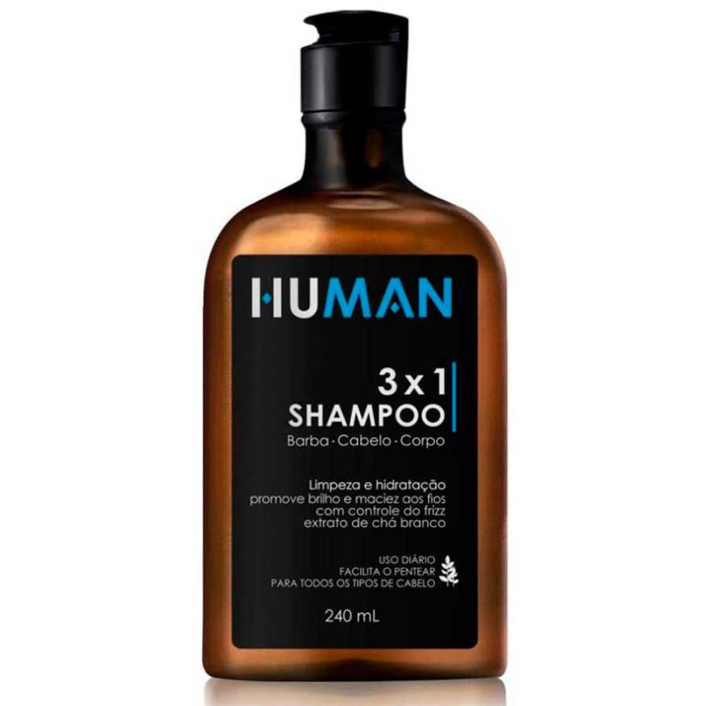 Shampoo 3x1 - Para Cabelo, Corpo e Barba Beneficios:- Mais Pratico, para Cabelo, Corpo e Barba- Combate Impurezas do dia a dia- Promove Hidratação- Extrema Maciez aos Fios- Hidratação a Pele O Shampoo 3x1 HUMAN Barba, Cabelo e Corpo foi desenvolvido para o homemmoderno com estilo próprio. Possuí como ativo principal o Extrato de Chá Branco queatua como antioxidante, condicionante e combate as impurezas do dia a dia. Promovehidratação e extrema maciez para os fios e para a pele.