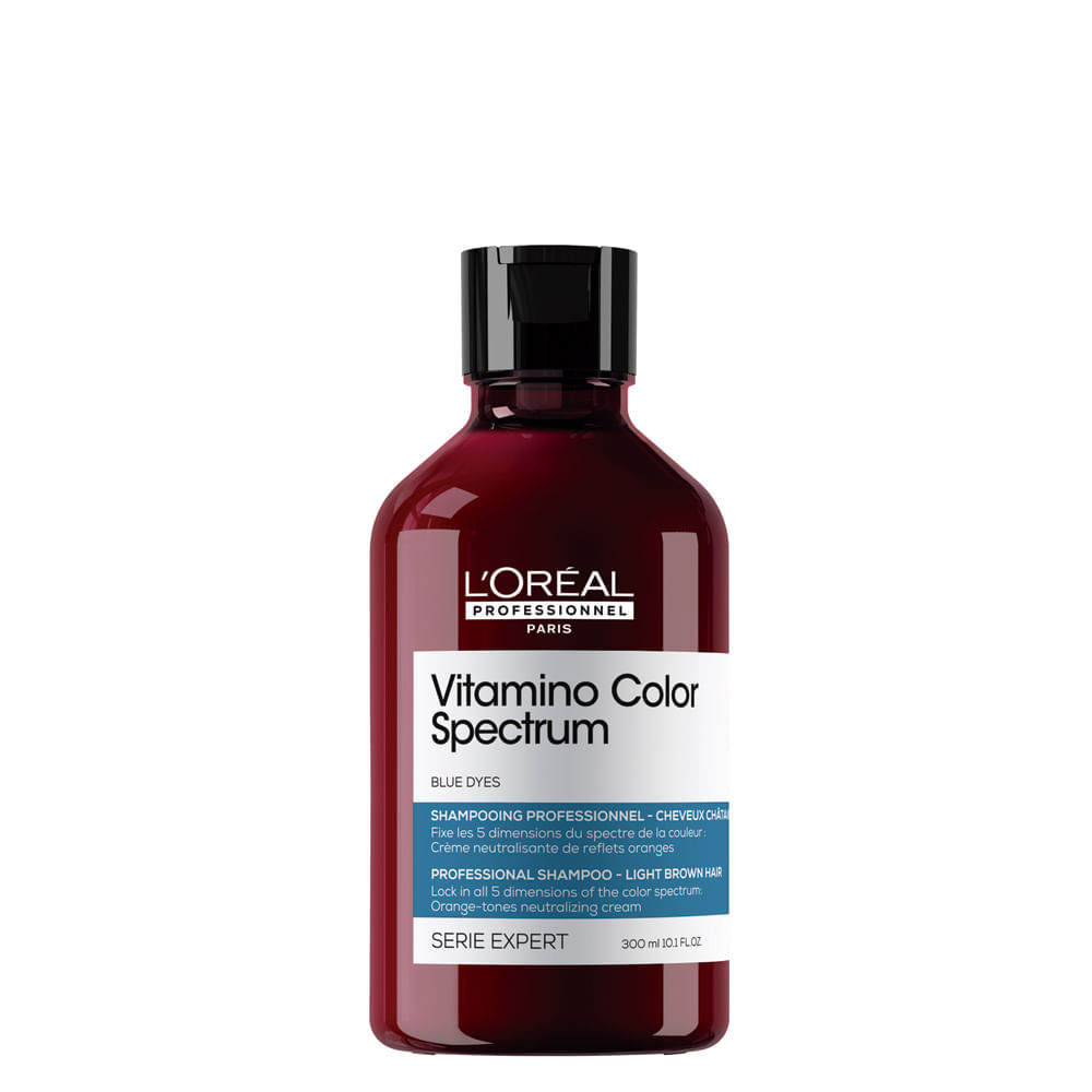 Vitamino Color Spectrum Shampoo Profissional Matizador de Tons Alaranjados de L'oréal Professionnel, Formulado com Pigmentos Azuis & Agentes de Tratamento. a Tecnologia Ajuda a Fixar Os Pigmentos Na Fibra Capilar para Fixar a Cor Vibrante do Dia 1 Por Até 100 Dias*. Resultados em 5 Dimensões da Cor**:1. Brilho: Brilho Espelhado Ultraintenso . 2. Saturação: Cores Ricas e Vibrantes. 3. Contraste: Percepção Ideal Entre Múltiplos Tons. 4. Tom: Reflexos Indesejados Neutralizados. 5. Luminosidade: Níveis de Luminosidade e Profundidade São Bem Preservados. a Fórmula Cremosa Azul Neutraliza Instantaneamente Subtons Alaranjados Indesejados para Cabelos Castanho-Claros. o Cabelo Fica Limpo e Nutrido. *teste Instrumental com a Linha Completa Vitamino Color Spectrum **teste Instrumental com a Linha Completa Vitamino Color Spectrum Após 4 Semanas.