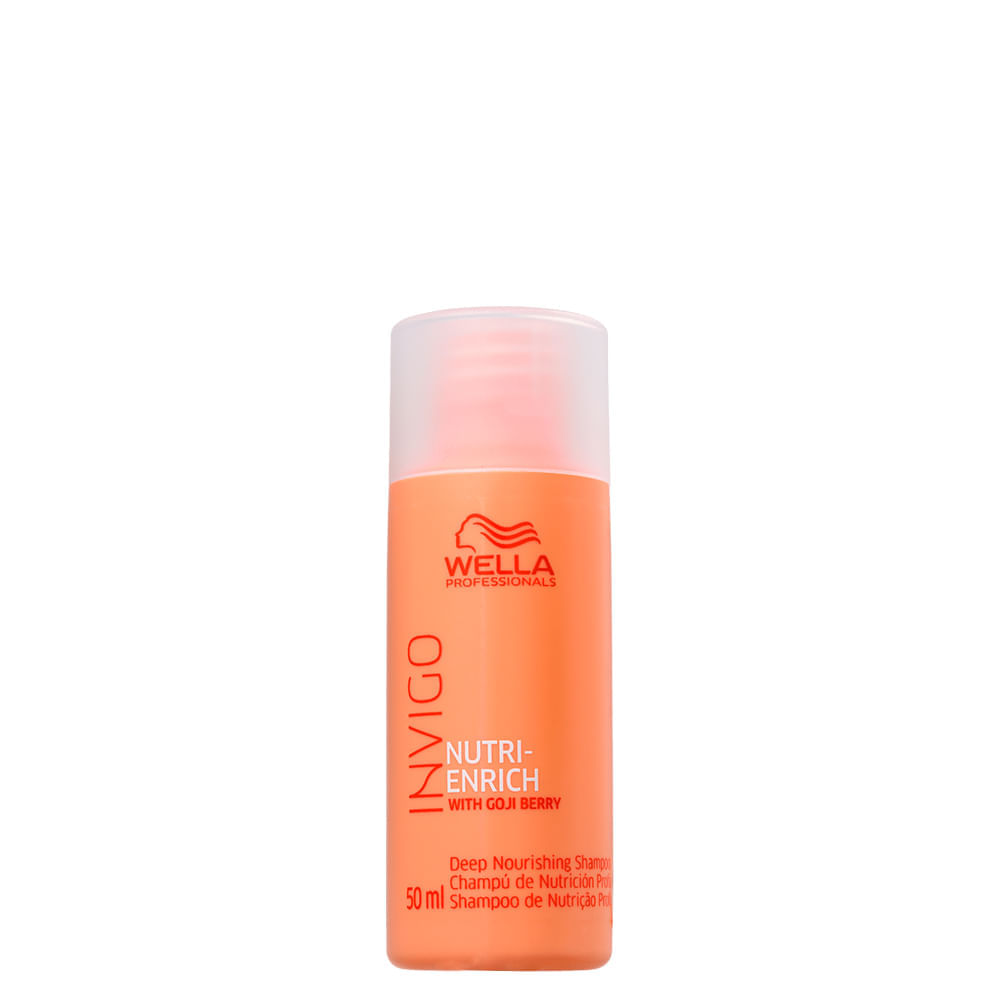 Shampoo Wella Professionals Invigo Nutri-Enrich 50ml – Nutrição Imediata, Hidratação Intensa e BrilhoShampoo para cabelos secos, ressecados ou quimicamente tratados, o Shampoo Wella Professionals Invigo Nutri-Enrich limpa delicadamente enquanto nutre e hidrata intensamente, deixando os fios visivelmente mais saudáveis com muito mais brilho e maciez, desde a primeira aplicação. É uma versão compacta que oferece praticidade para o seu dia a dia.A linha Wella Invigo Nutri-Enrich foi desenvolvida para restaurar a vitalidade dos fios danificados e prevenir novos danos. Sua exclusiva tecnologia Nutri-Enrich Complex combina ácido oleico, pantenol e vitamina E para repor nutrientes essenciais e promover um toque sedoso imediato. Além disso, conta com Goji Berry, fruta altamente nutritiva que melhora a saúde dos cabelos.Sua fórmula é rica em ingredientes que conseguem proporcionar maciez absoluta e muito brilho, uma vez que suaviza a superfície do cabelo. Wella Professionals Invigo Nutri-Enrich Shampoo, ainda possui um perfume luxuoso frutal chipre almiscarado.Wella Professionals Invigo Nutri-Enrich Shampoo tem o poder de hidratar e nutrir os fios desde o momento da lavagem e, assim, vai muito além de limpar.Benefícios do ShampooNutrição imediata e hidratação profunda dos fiosLimpeza eficaz sem ressecarMaciez absoluta desde a primeira aplicaçãoBrilho visível e toque sedosoRende mais em lavagens e aplicaçõesProtege contra novos danosAção/Resultado dos Ativos Goji Berry – Rica em vitaminas, antioxidantes, minerais e peptídeos que revitalizam os fios e melhoram a saúde do cabelo.Ácido Oleico – Proporciona nutrição profunda e suavidade ao toquePantenol – Ajuda a manter a hidratação e a maciez dos cabelosVitamina E – Ação antioxidante que combate o estresse oxidativo e previne o envelhecimento capilarModo de Usar o Shampoo Wella Professionals Invigo Nutri-EnrichAplique uma quantidade equivalente ao tamanho de uma moeda de 1 real nos cabelos molhados.Massageie suavemente o couro cabeludo até formar espuma.Enxágue bem.Se necessário, repita o processo.Para melhores resultados, finalize com os produtos da linha Wella Invigo Nutri-Enrich.Itens Inclusos: 1 Shampoo Wella Professionals Invigo Nutri Enrich 50 ml;Observações: Imagem Meramente Ilustrativa.;Gênero: Unissex;Linha: Invigo Nutri Enrich;Categoria: Shampoos;Categoria: Ver Todos;Tipo de Cabelo: Secos ou Ressecados;Tipo de Cabelo: Ver Todos;Similares - Thumb de Conteúdo: 50 ml;