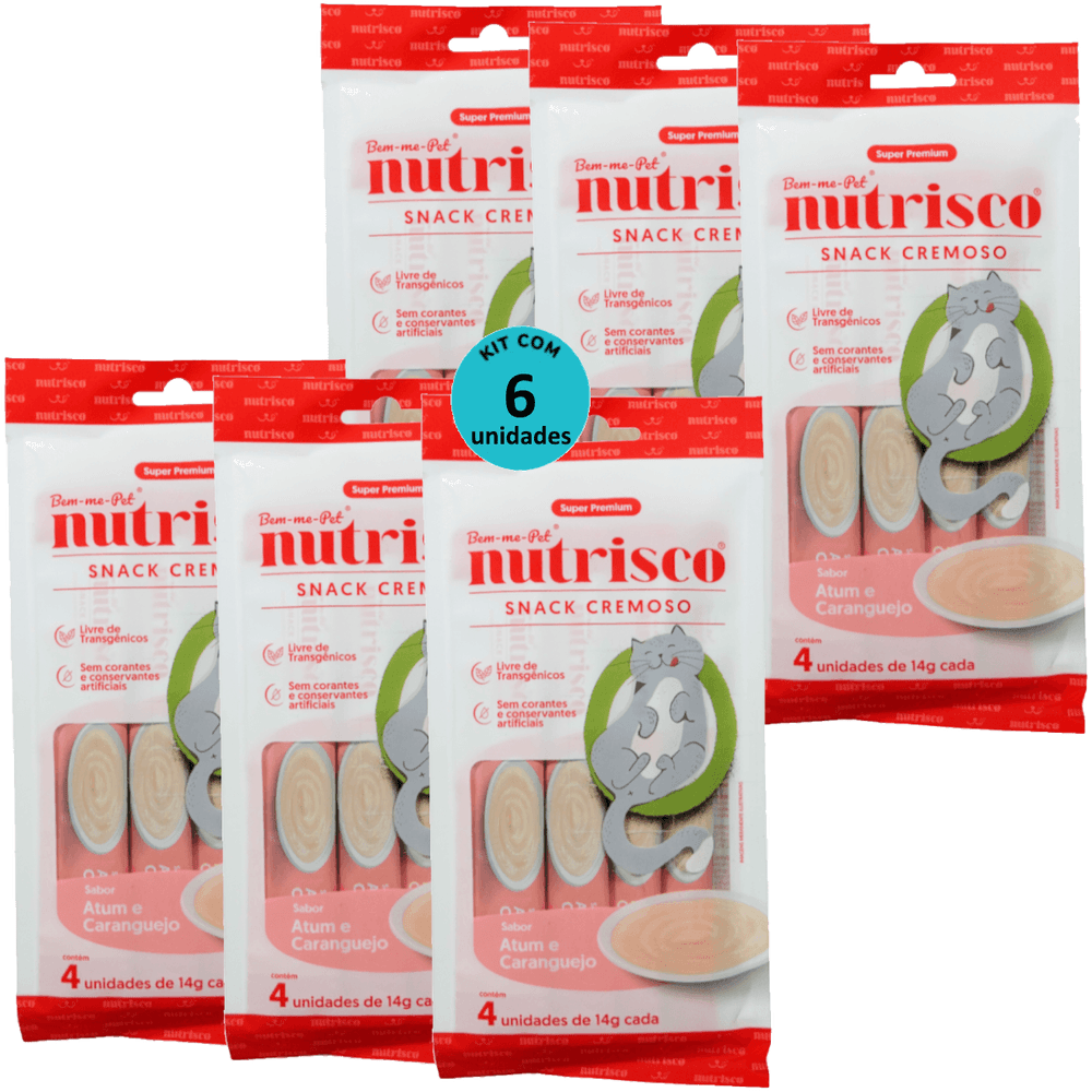SNACK CREMOSO NUTRISCO GATOS 14G ATUM E CARANGUEJO COM 4 UN - KIT COM 6Super Premium;Livre de transgênicos;Sem conservantes artificiais;Altamente palatável;Grain free;Contém 37,4% de proteína;Contém Taurina.Snack Cremoso Nutrisco Atum e CaranguejoOs Snacks Cremosos Nutrisco são ótimos para serem oferecidos como agrado ou recompensa para os gatos. Sua fórmula altamente palatável contém vitaminas e alta umidade!INDICAÇÃO:Alimento específico para gatos. Este alimento não substitui o alimento completo.MODO DE USAR:Fornecer em temperatura ambiente. Gatos filhotes: até 2 sachês por dia; Gatos adultos: até 5 sachês por dia.COMPOSIÇÃO: Atum (23,01%), Caranguejo (4,1%), Frango (10,25%), Amido, Taurina (0,08%), Vitaminas (0.004%) (A, B2, B3, B5, D3, E), Goma Xantana e Água.NÍVEIS DE GARANTIA: Umidade (Máx.) 900g/kg, Proteína Bruta (Mín.) 65g/kg, Extrato Etéreo (Mín.) 0,2g/kg, Matéria Fibrosa (Máx.) 10g/kg, Matéria Mineral (Máx.) 20g/kg, Cálcio (Máx.) 1,5g/kg, Cálcio (Mín.) 0,1g/kg, Fósforo (Mín.) 0,5g/kg em (kcal/g) = 0,29.CONSERVAÇÃO DO PRODUTO: Conservar em local seco e arejado, longe da luz solar. Após aberto, conservar sob refrigeração e consumir em até 48 horas.Porte: Todos;Tipo de Ração: Petiscos;Indicação: Gatos;