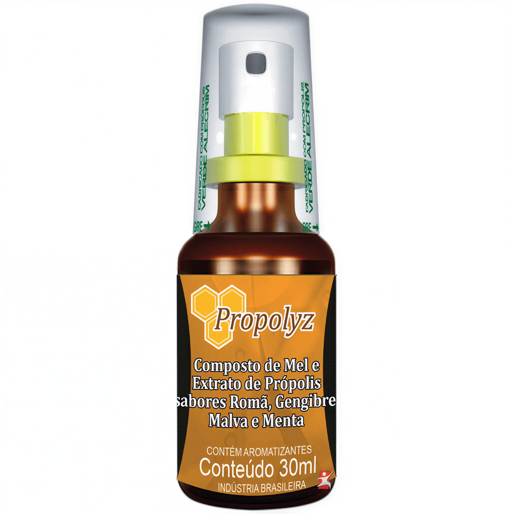 SPRAY LARANJA - MEL E PRÓPOLIS COM ROMÃ, GENGIBRE, MALVA E HORTELÃ 30ML - PROPOLYZ Todos os sprays da Propolyz são elaborados com Própolis Verde Alecrim. A própolis Verde Alecrim é produzida na região do Centro Oeste de Minas Gerais, nos apiários da empresa Natucentro e coletada nas colmeias por apicultores especializados. É conhecida internacionalmente como própolis verde. Green própolis, a qual tem como principal fonte vegetal a planta (Baccharis Dracunculifolia), alecrim do campo ou popular vassourinha, possuindo uma coloração verde.É considerada a melhor própolis do mundo, sendo amplamente consumida no Japão. Própolis é uma substância resinosa obtida pelas abelhas através da coleta de resinas da floras (pasto apícola) da região, e alteradas pela ação das enzimas contidas em sua saliva. A cor, sabor e o aroma da própolis variam de acordo com a origem botânica. As abelhas produzem o própolis em defesa da colméia, elas recobrem a entrada a fim de protegê-las contra fungos e bactérias. NÃO CONTÉM GLÚTEN