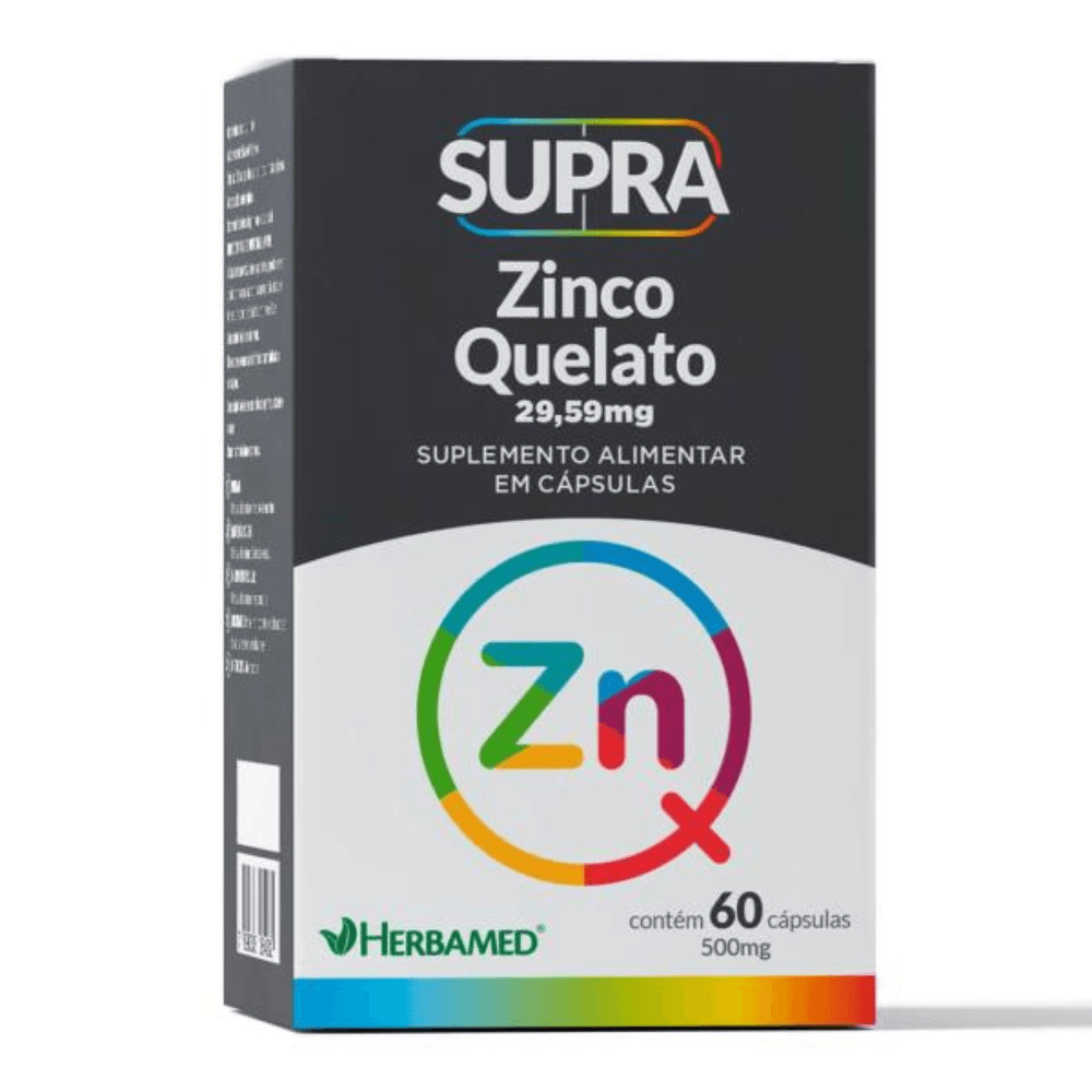 Supra Zinco Quelato com 60 Cápsulas - Herbamed é um suplemento mineral desenvolvido para fornecer uma dose adequada de zinco, um nutriente essencial para diversas funções corporais. Cada cápsula contém 29,59 mg de zinco na forma de bisglicinato, conhecida por sua alta biodisponibilidade. Benefícios:Fortalecimento do sistema imunológico: O zinco auxilia no funcionamento adequado do sistema imunológico, aumentando a resistência a infecções. Manutenção da saúde óssea: Contribui para a formação e manutenção de ossos e dentes saudáveis. Funcionamento muscular: Auxilia no bom funcionamento dos músculos, sendo importante para a saúde muscular. Ação antioxidante: Atua como antioxidante, protegendo as células contra danos causados pelos radicais livres. Ingredientes: Zinco bisglicinato, antiumectante silicato de magnésio. Cápsula: gelificante gelatina, água purificada, umectante glicerina. Não contém glúten. Modo de uso: Ingerir uma cápsula ao dia, preferencialmente junto às refeições, ou conforme orientação de um profissional de saúde. Advertências:Este produto não é um medicamento.Não exceder a recomendação diária de consumo indicada na embalagem.Mantenha fora do alcance de crianças.Gestantes, lactantes e crianças até 3 anos devem consumir este produto sob orientação de um profissional de saúde.