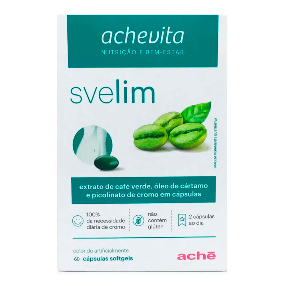 O Svelim Aché Softgels é formulado por café verde, picolinato de cromo e óleo de cártamo, que podem auxiliar na perda de peso. O produto natural conta com benefícios no controle lipídico e é indicado para a prevenção de quadros de obesidade. A embalagem contém 60 cápsulas.