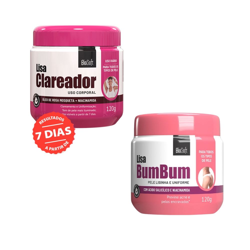 Kit Clareador Rosa Mosqueta + Creme Anti-Espinhas no Bumbum Lisa Bio SoftChegou a combinação perfeita para quem busca pele do bumbum mais uniforme, macia e livre de imperfeições!Clareador Rosa Mosqueta – fórmula suave que ajuda a reduzir manchas escuras, uniformiza o tom da pele e hidrata profundamente, deixando a região mais bonita e saudável.Creme Anti-Espinhas no Bumbum – desenvolvido para tratar e prevenir aquelas indesejadas bolinhas e espinhas, promovendo uma pele lisa, renovada e livre de marcas.Benefícios:Clareia e uniformizaCombate espinhas e foliculiteHidrata e suaviza a pele------------------------------------------------------Lisa Bumbum Bio Soft 120gVocê sabia que problemas como acne e espinhas não são exclusivos da área do rosto, mas também podem aparecer na região do bumbum? Sabemos que esse tipo de problema incomoda muito, principalmente quando colocamos um biquíni  e sentimos vergonha da situação que se encontra a pele. Pensando nisso a Bio Soft lançou a solução perfeita para você: o Lisa Bumbum. O Lisa Bumbum é um creme formulado com ingredientes cuidadosamente selecionados, como: Ácido salicílico, Niacinamida e Óleo de Semente de Uva, que juntos promovem uma renovação celular, uniformização da textura e tom da pele, além de hidratação profunda, evitando e prevenindo o surgimento de acnes e pelos encravados no bumbum.Lisa Bumbum é um creme de fácil aplicação que proporciona um cuidado prático e eficaz para seu glúteo. Não perca mais tempo sofrendo com acnes, pelos encravados e espinhas no bumbum! Adquira agora mesmo o creme e sinta a diferença na sua pele! Principais Benefícios:Ajuda a combater acnes, espinhas e pelos encravadosUniformiza a textura e tom da pelePromove renovação celular e hidratação profundaAtivos:Ácido salicílico: Ajuda controlar as glândulas sebáceas. Tem ação anti-seborréica, anti-microbiano e anti-inflamatório, o que ajuda a controlar a formação das lesões de cravos e espinhas.Niacinamida: Estimula a renovação celular, ajuda a uniformizar o tom da pele, oferecendo hidratação e prevenindo o surgimento de manchas. Além disso, sua ação antioxidante combate o envelhecimento precoce da pele.Óleo de Semente de Uva: Oferece firmeza e elasticidade para pele, age como anti-inflamatório, mantém a pele hidratada, prevenindo o ressecamento.ANVISA PROCESSO 25351.072350/2022-32 AFE 201236-1--------------------------------------------------------------------Creme Lisa Clareador Rosa Mosqueta Bio Soft 120gRecupere a uniformidade da sua pele com o poderoso Clareador Lisa Rosa Mosqueta e Niacinamida da Bio Soft! Desenvolvido especialmente para clarear axilas, virilha, joelhos e cotovelos, este produto combina dois ativos altamente eficazes no tratamento de manchas escuras: o Óleo de Rosa Mosqueta, conhecido por sua ação regeneradora, e a Niacinamida, que atua no controle da hiperpigmentação.Resultados visíveis em até 7 dias de uso contínuo! Lembrando que pode ser maior dependendo do tipo de pele e da extensão da área escurecida!Sua fórmula leve, hidratante e de rápida absorção penetra profundamente na pele, ajudando a reduzir a produção e a distribuição da melanina, combatendo as manchas escuras causadas por atrito, exposição solar, envelhecimento ou depilação.Benefícios do Clareador Bio Soft Rosa Mosqueta e Niacinamida:Uniformiza o tom da pele com eficácia comprovada;Ilumina e suaviza áreas escurecidas, promovendo um toque sedoso;Indicado para clareamento íntimo, como axilas e virilha;Dermatologicamente e ginecologicamente testado;Fórmula segura para uso diário;Resultado dos estudos:90% de melhora no clareamento das axilas;80% de melhora no clareamento da virilha.Use no mínimo 3x ao dia para alcançar os resultados.ANVISA PROCESSO: 25351.083262/2025-17 AFE 201236-1.--------------------------------------------------------Principais Tags de Pesquisa:acabar com espinhas no bumbum, bumbum sem espinhas, creme para espinhas no bumbum, espinhas e manchas no bumbum, remedio para espinha no bumbum, tirar espinhas do bumbum, tratamento para espinhas no bumbum, pomada para espinha no bumbum, espinha no bumbum como tratar, bumbum sem manchas, clareador de manchas no bumbum, clarear mancha no bumbum, clarear manchas bumbum,  clarear manchas de foliculite nas nadegas, clarear virilha e bumbum, creme clareador de mancha no bumbum, creme para clarear manchas no bumbum, creme para clarear nadegas