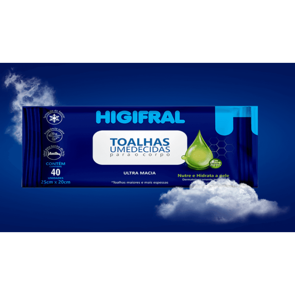 As Toalhas Umedecidas para o Corpo - Higifral foram desenvolvidas para oferecer limpeza, frescor e conforto a qualquer momento do dia. Com um tamanho maior e textura macia, são ideais para higienização do corpo todo, proporcionando uma sensação refrescante sem necessidade de enxágue.Perfeitas para o dia a dia, viagens, pós-treino e cuidados com pessoas acamadas.???? Principais benefícios: ? Extra macias e resistentes ? Fórmula suave com aloe vera ? Livre de álcool etílico ? Dermatologicamente testadasComposição: Medidas: 25 cm x 20 cm. Embalagem: Pacote com 40 unidades.;