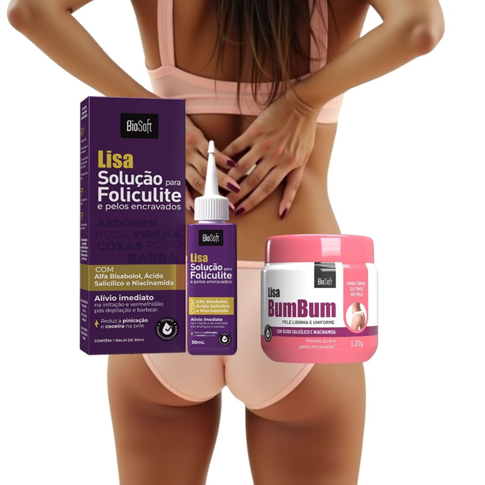 Livre-se de Espinhas, Foliculite e Pelos Encravados de Forma Rápida e Eficaz!Se você está cansada de lidar com cravos, espinhas no bumbum, foliculite e pelos encravados, chegou a solução perfeita: o Kit Completo de Tratamento Intensivo. Composto por dois produtos poderosos:Creme para Bumbum Anti Espinha: Fórmula exclusiva com Ácido Salicílico e Niacinamida com ativos anti-inflamatórios, hidratantes e renovadores.Balm Anti Foliculite e Pelo Encravado: Um tratamento concentrado que suaviza a pele, evitando marcas e irritações.Benefícios do Kit:Previne e trata espinhas e pêlos encravados no bumbum e na coxaCombate foliculite de maneira profundaReduz vermelhidão e desconfortoPromove hidratação intensa sem deixar a pele oleosaAuxilia na renovação celularPele mais lisa, macia e livre de manchas----------------------------------------------Creme Lisa Bumbum Bio Soft 120gVocê sabia que problemas como acne e espinhas não são exclusivos da área do rosto, mas também podem aparecer na região do bumbum? Sabemos que esse tipo de problema incomoda muito, principalmente quando colocamos um biquíni e sentimos vergonha da situação que se encontra a pele. Pensando nisso a Bio Soft lançou a solução perfeita para você: o Lisa Bumbum. O Lisa Bumbum é um creme formulado com ingredientes cuidadosamente selecionados, como: Ácido salicílico, Niacinamida e Óleo de Semente de Uva, que juntos promovem uma renovação celular, uniformização da textura e tom da pele, além de hidratação profunda, evitando e prevenindo o surgimento de acnes e pelos encravados no bumbum.Lisa Bumbum é um creme de fácil aplicação que proporciona um cuidado prático e eficaz para seu glúteo. Não perca mais tempo sofrendo com acnes, pelos encravados e espinhas no bumbum! Adquira agora mesmo o creme e sinta a diferença na sua pele! Principais Benefícios:Ajuda a combater acnes, espinhas e pelos encravadosUniformiza a textura e tom da pelePromove renovação celular e hidratação profundaAtivos:Ácido salicílico: Ajuda controlar as glândulas sebáceas. Tem ação anti-seborréica, anti-microbiano e anti-inflamatório, o que ajuda a controlar a formação das lesões de cravos e espinhas.Niacinamida: Estimula a renovação celular, ajuda a uniformizar o tom da pele, oferecendo hidratação e prevenindo o surgimento de manchas. Além disso, sua ação antioxidante combate o envelhecimento precoce da pele.Óleo de Semente de Uva: Oferece firmeza e elasticidade para pele, age como anti-inflamatório, mantém a pele hidratada, prevenindo o ressecamento.ANVISA PROCESSO 25351.072350/2022-32 AFE 201236-1Modo de usar: Com a área limpa e seca, aplique uma pequena quantidade do produto e massageie com movimentos circulares para facilitar a absorção. ---------------------------------Balm para Foliculite e Pelos Encravados Lisa Bio Soft 30mlAcabe com a foliculite e pelos encravados de forma eficaz! O Balm Solução para Foliculite e Pelos Encravados Lisa Bio Soft foi desenvolvido com alta tecnologia dermocosmética para tratar, acalmar e recuperar a pele após a depilação ou o barbear – seja com lâmina, aparelho elétrico ou cera.Ideal para todos os tipos de pele, o balm é indicado tanto para homens quanto mulheres que sofrem com irritações pós-depilatórias, pelos encravados e vermelhidão.Pode ser usado no: rosto, peito, coxas, nuca, abdomên, pescoço, virilha, axilas e glúteos evitando área de mucosa.Fórmula poderosa com ativos dermatologicamente reconhecidos:Alfa Bisabolol – calmante natural que reduz a inflamação e vermelhidão.Ácido Salicílico – promove esfoliação suave, prevenindo pelos encravados.Niacinamida (Vitamina B3) – hidrata profundamente, equilibra a oleosidade e uniformiza o tom da pele.Com textura leve e de rápida absorção, o Balm Lisa Bio Soft proporciona refrescância imediata, suavidade ao toque e uma fragrância agradável que deixa a pele renovada e perfumada.Resultados comprovados em testes de eficácia:100% dos participantes observaram:Redução significativa da foliculitePrevenção eficaz contra pelos encravadosAlívio da vermelhidão, coceira e ardência após a depilação ou barbear67% dos voluntários relataram:Uniformização do tom da pele73% observaram:Controle da oleosidade excessiva, deixando a pele equilibrada e saudávelBenefícios principais do Balm Solução para Foliculite:Combate foliculite e pelos encravadosHidrata e acalma a pele irritadaControla a oleosidade sem obstruir os porosPode ser usado diariamente, após a depilação ou barbearANVISA PROCESSO: 25351.367759/2024-04 Aut/MS 201236-1Modo de uso: Com a pele limpa e seca, aplique uma pequena quantidade do produto nas mãos e espalhe suavemente até absorção na área depilada. Pode ser usado: rosto, barba, peito, coxas, nuca, abdômen, pescoço, virilha, axilas e glúteos evitando áreas de mucosa. Indicamos uso diário para melhores resultados. -------------------Principais Tags de Pesquisa:tratamento para foliculite virilha, tratar foliculite virilha, produto para foliculite na virilha, cremes para foliculite na virilha, tratamento para pelos encravados na virilha, creme para foliculite no gluteo, creme para foliculite no bumbum, tratamento para foliculite no gluteo, acabar com foliculite no bumbum, tratamento para foliculite na nadega, acne no bumbum, foliculite no bumbum, pelo encravado no bumbum, espinhas no glúteo, bolinhas no bumbum, tratamento para espinhas no bumbum, cuidados com a pele do bumbum, acabar com espinhas no bumbum, tirar espinhas do bumbum, espinhas no bumbum como acabar, acne no gluteo