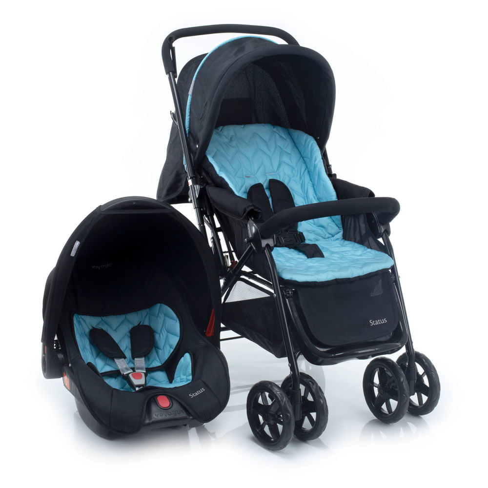 Bebê Conforto Status Voyage incluído com cinto de segurança de 3 pontos com protetores de ombros acolchoados, 3 posições de altura e ajuste centralizado com botão frontal. Apoio de cabeça e almofada redutora reposicionáveis, removíveis e com função dupla face que permite variar o visual do produto.