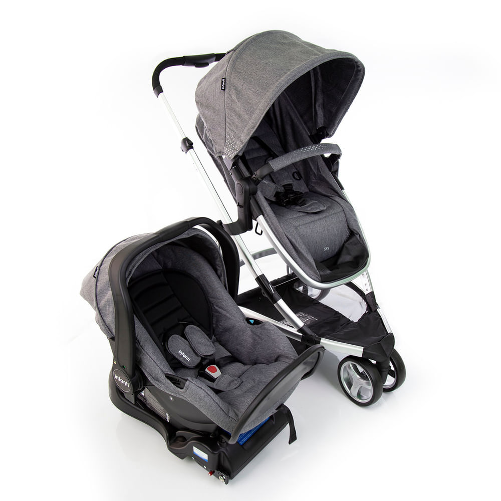O Travel System Sky Trio é um conjunto completo de carrinho, bebê conforto e base veicular. Tecidos com toque macio e detalhes refletivos, deixam o visual do carrinho ainda mais estiloso.