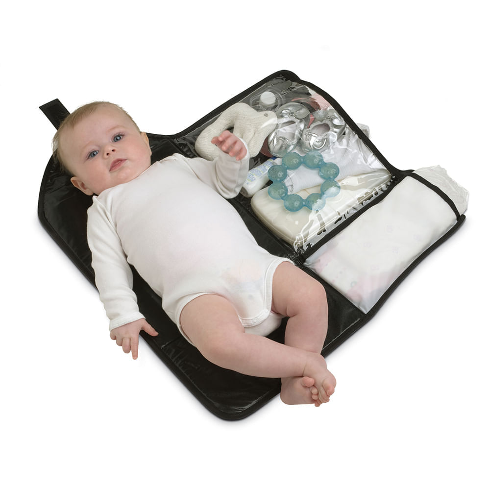 Trocador com design compacto em formato de estojo dobrável, com bolsos plásticos internos e superfície fácil de limpar.