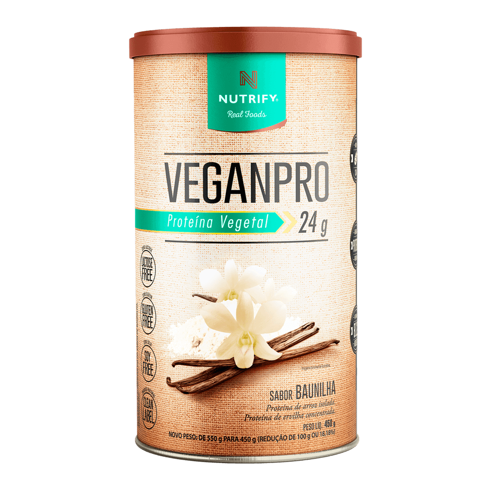 ;Texto direita: QUALIDADE PROTEICA DOS ALIMENTOS O valor nutricional de uma proteína apresenta variações entre si que dependem da composição de aminoácidos essenciais e da sua capacidade de digestão. Para isso, é possível utilizar uma medida de avaliação de qualidade, realizada para analisar se uma determinada proteína promove suas funções de forma adequada no organismo. O que é valor biológico de uma proteína? Ferramenta que mede a integridade com que os alimentos fornecem os aminoácidos essenciais, quando consumidos. O que é digestibilidade proteica? É o percentual do quanto de proteína ofertada é de fato absorvida no trato gastrointestinal na forma de aminoácido atuando, portanto, como um determinante da qualidade proteica da alimentação. QUALIDADE PROTEICA • Proteínas de alta qualidade Contêm todos os aminoácidos essenciais. São bem digeridas pelo estômago e intestino delgado. São bem absorvidas pelo intestino delgado. • Proteínas complementares Combinação de fontes proteicas que compensam a falta de aminoácidos essenciais. PROTEÍNA VEGETAL Blends de proteínas vegetais, incluindo cereais, sementes oleaginosas e leguminosas, resultam em mix proteico de alto valor biológico. Presentes na alimentação, sobretudo, em razão da substituição das fontes animais, os blends proteicos vegetais são capazes de alcançar a mesma qualidade da proteína animal. VEGANPRO À base de proteína isolada de arroz, proteína concentrada de ervilha e sementes de chia em pó, VEGANPRO NUTRIFY é indicado para complementar a alimentação de quem necessita de um aporte proteico de qualidade e alta biodisponibilidade. Cada porção conta com 24g de proteínas e 50% do valor diário de vitamina B12. CONHEÇA AS FONTES VEGETAIS DE VEGANPRO • ERVILHA: excelente fonte proteica de alta biodisponibilidade e digestibilidade, evidências apontam para os benefícios da fibra alimentar da ervilha na saúde intestinal, no controle glicêmico e do perfil lipídico. • ARROZ: o isolado proteico do arroz é hipoalergênico, contém 8% de leucina e pode ser um suplemento eficiente para melhorar a hipertrofia muscular em combinação com treinamentos de resistências. • SEMENTES DE CHIA: repletas de ácidos graxos do tipo ômega-3 e de polifenóis, as sementes de chia ajudam a proteger contra a inflamação e contribuem para a redução do colesterol. Benefícios e diferenciais: - VEGANPRO cacau e VEGANPRO cappuccino oferecem 1,8g de fibras/porção. - VEGANPRO baunilha oferece 2,3g de fibras/porção. - Enriquecido com vitamina B12. - Ideal para enriquecer a alimentação de vegetarianos e veganos. - Baixo teor de sódio. - Não possui conservantes e corantes artificiais na fórmula. - Não contém soja. - Isento de glúten e lactose.;pra-que-serve-banner: https://nutrifysaude.vtexassets.com/assets/vtex.file-manager-graphql/images/282d13bb-1bc2-4191-a9d8-dc41e9542cf3___69e2087262092c210fdb6ecf77d6bd0f.webp;como-tomar-imagem: https://nutrifysaude.vtexassets.com/assets/vtex.file-manager-graphql/images/ac6f6260-6652-4bd8-99b7-f0f27975e153___dfd2bc37024fe74f2bbc58aceb07f73b.webp;Valor Desconto Minimo: https://nutrifysaude.vtexassets.com/assets/vtex.file-manager-graphql/images/1216c7c2-9fd8-4cfc-a07d-5ab911c19465___3130205faa329eac4b979a0660e15893.webp;beneficios-titulo: Força vegetal. Saúde do seu jeito.;beneficios-texto: À base de proteínas de arroz e ervilha, com adição de chia em pó, Vegan Pro é um suplemento especialmente desenvolvido para fornecer um rico aporte proteico, ofertando 4,5 g de BCAA em cada porção. Adicionado de fibras que auxiliam na saúde intestinal.;items-beneficios: [ "https://nutrifysaude.vtexassets.com/assets/vtex.file-manager-graphql/images/20ca251e-9d6a-4a2d-b95f-e64c1a242547___4c73bc50c3c0b0b9a35b72a632062b4c.svg; **Proteínas Vegetais de Qualidade:** Vegan Pro contém proteínas isoladas de arroz integral orgânico e concentradas de ervilha orgânica. Essas proteínas são facilmente absorvidas pelo corpo e ajudam na recuperação muscular e no suporte ao sistema imunológico." , "https://nutrifysaude.vtexassets.com/assets/vtex.file-manager-graphql/images/59af9e44-128c-4d1e-b4ea-7d5b3467bdc4___594f5f1b72b86975ade6090b60a3a802.svg;**Isento de Lactose e Glúten:** Ideal para veganos, vegetarianos e pessoas com intolerância à lactose ou glúten." , "https://nutrifysaude.vtexassets.com/assets/vtex.file-manager-graphql/images/61e87602-e4f0-457f-9c5d-0990529b8e3f___218f1ef82aa48f80b87a7f902dafd1b5.svg;**Baixo Teor de Sódio:** Vegan Pro é uma escolha saudável para quem busca reduzir o consumo de sódio." , "https://nutrifysaude.vtexassets.com/assets/vtex.file-manager-graphql/images/14e1d637-8522-4bea-962f-1f5bc1cb7913___7bcb8362047b662c0ed02d889bf98c59.svg;**Rico em Vitamina B12:** Essa vitamina é essencial para dietas vegetarianas e veganas e VeganPro oferece uma dose significativa." , "https://nutrifysaude.vtexassets.com/assets/vtex.file-manager-graphql/images/61e87602-e4f0-457f-9c5d-0990529b8e3f___218f1ef82aa48f80b87a7f902dafd1b5.svg;**Sem Adoçantes ou Conservantes Artificiais:** Priorizamos ingredientes naturais para sua saúde." ];background-beneficios-m: https://nutrifysaude.vtexassets.com/assets/vtex.file-manager-graphql/images/fc5447b9-dcde-4685-88ca-d8599fc66da6___2ecd8e8f704899c86270011e042dfc90.png;background-beneficios-d: https://nutrifysaude.vtexassets.com/assets/vtex.file-manager-graphql/images/54ba4f20-ec85-4d19-bb8f-86909aea5440___12f1aa81b20a0fc1d8c9957976849598.png;descricao-tabela: **Vegan Pro** Nutrify é um suplemento alimentar especialmente desenvolvido para quem busca uma fonte de proteína vegetal de alta qualidade. Combinando proteínas orgânicas de arroz integral e ervilha, o VeganPro oferece um equilíbrio perfeito para sua saúde e bem-estar.;descricao-tabela-background-d: https://nutrifysaude.vtexassets.com/assets/vtex.file-manager-graphql/images/eccdc825-8879-4bd8-8872-5ab4edd40b1f___9657c54e9c2de1bb6d2485d50
