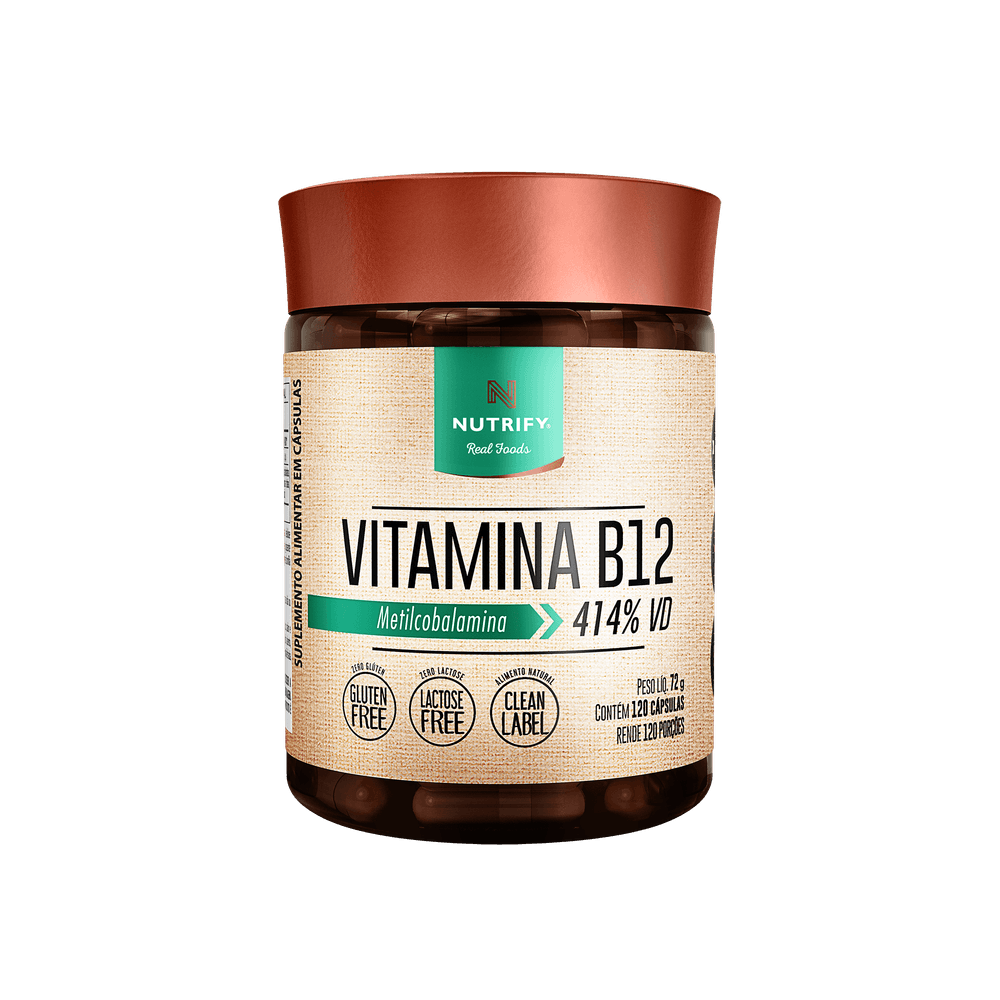 ;Indicado Para: Energia;Claim Prateleira: claim-gluten-free.png|claim-lactose-free.png|claim-clean-label.png;Conteúdo Especial: Immune Support;Conteúdo Especial: Red Cells Support;Conteúdo Especial: Vegan Product;Claim Inferior: Clean Label;Claim Inferior: Gluten Free;Claim Inferior: Lactose Free;Benefícios do Produto: • Formação, maturação e integridade das células vermelhas do sangue; • Prevenção da anemia megaloblástica; • Desenvolvimento e manutenção do Sistema Nervoso Central; • Ótima fonte suplementar para dietas vegetarianas estritas.;Para que serve: Conhecida por ser hidrossolúvel e de extrema importância para o organismo, a vitamina B12 é essencial para inúmeros sistemas funcionarem da forma correta. Pode-se destacar a importância desse nutriente para a formação, maturação e integridade das hemácias, dessa forma, a vitamina B12 pode prevenir a anemia megaloblástica, doença caracterizada pela imaturidade e tamanho anormal das células vermelhas do sangue. A vitamina B12 também tem papel fundamental para o sistema nervoso central, onde participa de seu desenvolvimento e da sua manutenção, vale ressaltar que a deficiência dessa vitamina pode causar danos irreversíveis no sistema nervoso.;Como e quando tomar: Recomenda-se a ingestão de 1 cápsula de Vitamina B12 Nutrify por dia ou conforme a prescrição médica ou nutricionista.;Destaques: • Produto vegano • Metilcobalamina • Fornece 414% da indicação diária de vitamina B12 para adultos saudáveis;Produto é vegano?: Sim;beneficios-texto-2: Auxilia no funcionamento do sistema imune;beneficios-texto-3: Auxilia no metabolismo energético;beneficios-texto-4: Auxilia no metabolismo dos carboidratos, proteínas e gorduras;beneficios-texto-5: Auxilia no metabolismo da homocisteína;beneficios-texto-1: Auxilia na formação de células vermelhas do sangue;pra-que-serve-banner: https://nutrifysaude.vtexassets.com/assets/vtex.file-manager-graphql/images/083f4bd4-ca05-4acd-8a14-48df3b65f773___51c155ed2d97fa6d9c8088fa8cf3cf15.webp;como-tomar-imagem: https://nutrifysaude.vtexassets.com/assets/vtex.file-manager-graphql/images/6cc1abe8-f801-4422-a2a9-700b67ac4779___86dd2f4f022ee432a477a2163b2d68f7.webp;Valor Desconto Minimo: https://nutrifysaude.vtexassets.com/assets/vtex.file-manager-graphql/images/6adc5f54-4019-43d1-973b-869f2f605b00___1e2c69bae8df306cadc1bac69392d6d7.webp;beneficios-titulo: Benefícios da Vitamina B12 Nutrify;beneficios-texto: A vitamina B12 Nutrify em cápsula auxilia no fortalecimento do sistema imunológico e reposição desse nutriente importante para o organismo de forma prática e confiável. Garanta a ingestão dos níveis recomendados desse suplemento com nossas cápsulas produzidas com matéria-prima vegetal.;items-beneficios: [ "https://nutrifysaude.vtexassets.com/assets/vtex.file-manager-graphql/images/8e9642b5-af5c-4d37-ad19-391bf2caf08c___18295590e024b699e99a6e6d5c4a7d0d.svg; **Alta concentração:** Mais de 400% do VD recomendado em apenas uma cápsula." , "https://nutrifysaude.vtexassets.com/assets/vtex.file-manager-graphql/images/59af9e44-128c-4d1e-b4ea-7d5b3467bdc4___594f5f1b72b86975ade6090b60a3a802.svg;**Metilcobalamina:** Forma 100% natural do nutriente." , "https://nutrifysaude.vtexassets.com/assets/vtex.file-manager-graphql/images/32331fbd-9d0c-480b-954c-3fe1c63fa12e___fd72ab8fe13673379d81b945fb2c2716.svg;**Sem aditivos artificiais:** Nossa fórmula é *clean label.*" , "https://nutrifysaude.vtexassets.com/assets/vtex.file-manager-graphql/images/61e87602-e4f0-457f-9c5d-0990529b8e3f___218f1ef82aa48f80b87a7f902dafd1b5.svg; **Vegano:** Matéria-prima e cápsulas de origem vegetal" ];background-beneficios-m: https://nutrifysaude.vtexassets.com/assets/vtex.file-manager-graphql/images/423945a6-2731-4357-92e2-0f135f66b97a___9fca5515341fd535a2c0ee2881d3e88d.png;background-beneficios-d: https://nutrifysaude.vtexassets.com/assets/vtex.file-manager-graphql/images/a37942f8-9a5c-470a-a5a7-99b65379debb___6dddea90d00818650fd5d707da09dea7.png;titulo-descricao-tabela: Vitamina B12 Nutrify – Sua rotina de saúde começa bem assim.;descricao-tabela: A vitamina B12 Nutrify em cápsulas é um suplemento livre de aditivos artificiais, formulado com a forma natural desse nutriente, a metilcobalamina, oferecendo uma fonte pura e confiável de B12 para seu dia a dia. Ela é uma excelente escolha para todas as pessoas que desejam cuidar da sua saúde e bem-estar, mas principalmente vegetarianos e veganos, pois é produzido com matéria-prima e cápsulas de origem vegetal. Um dos pontos fortes da nossa vitamina do complexo B12 é a sua facilidade de ingestão em meio à rotina agitada. Mas, lembre-se: antes de iniciar o consumo, consulte um médico ou nutricionista para definir a dosagem ideal para o seu caso.;descricao-tabela-background-d: https://nutrifysaude.vtexassets.com/assets/vtex.file-manager-graphql/images/17be4f30-af7b-46ab-9002-8fb162101365___51d1fea50b9e6fdcc327f9733717783b.png;descricao-tabela-background-m: https://nutrifysaude.vtexassets.com/assets/vtex.file-manager-graphql/images/f79a2b4d-179f-40dd-82ef-e83b99107c2f___c3c6ea0c30a33fb924673c03a0159e05.png;texto-complementar: A vitamina B12 Nutrify em cápsula auxilia no fortalecimento do sistema imunológico e reposição desse nutriente importante para o organismo de forma prática e confiável.;texto-como-quando: Tome 1 comprimido da Vitamina B12 em cápsulas Nutrify diariamente, ou esporadicamente, conforme a prescrição do seu médico ou nutricionista. Assim como nossos outros produtos, esse suplemento conta com ingredientes naturais de qualidade em sua formulação. A suplementação de vitamina B12 é geralmente recomendada para pessoas que o organismo tem dificuldade para atingir os níveis ideais do nutriente através da alimentação diária (não apenas vegetarianos/veganos). É importante analisar o seu caso junto do médico ou nutricionista para definir uma estratégia de suplementação e/ou alimentaç